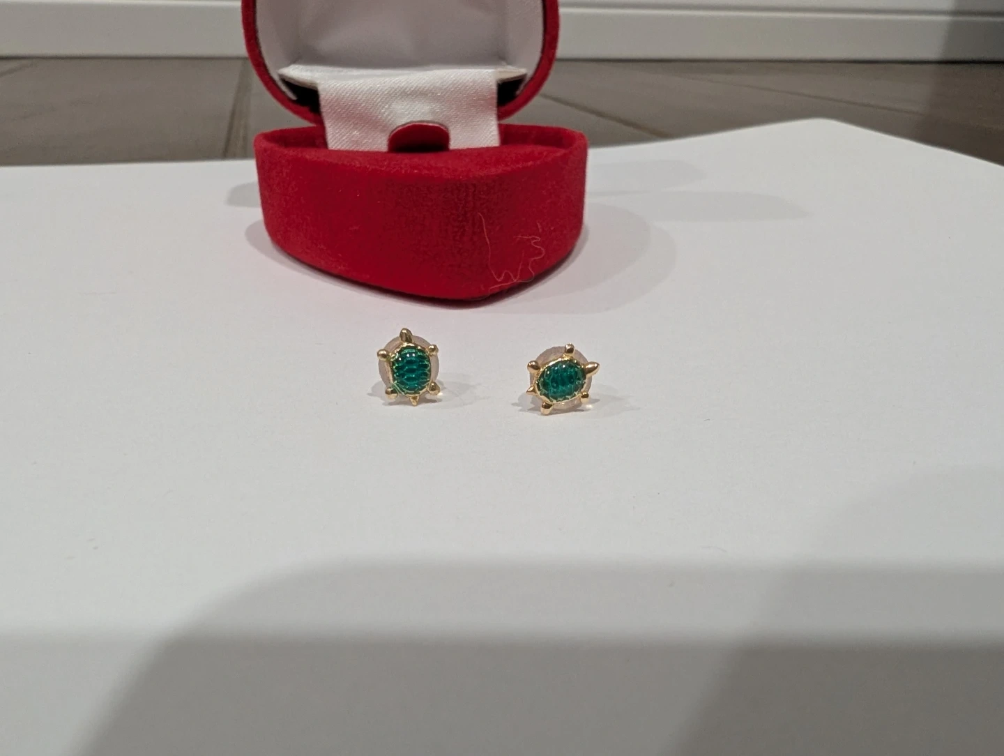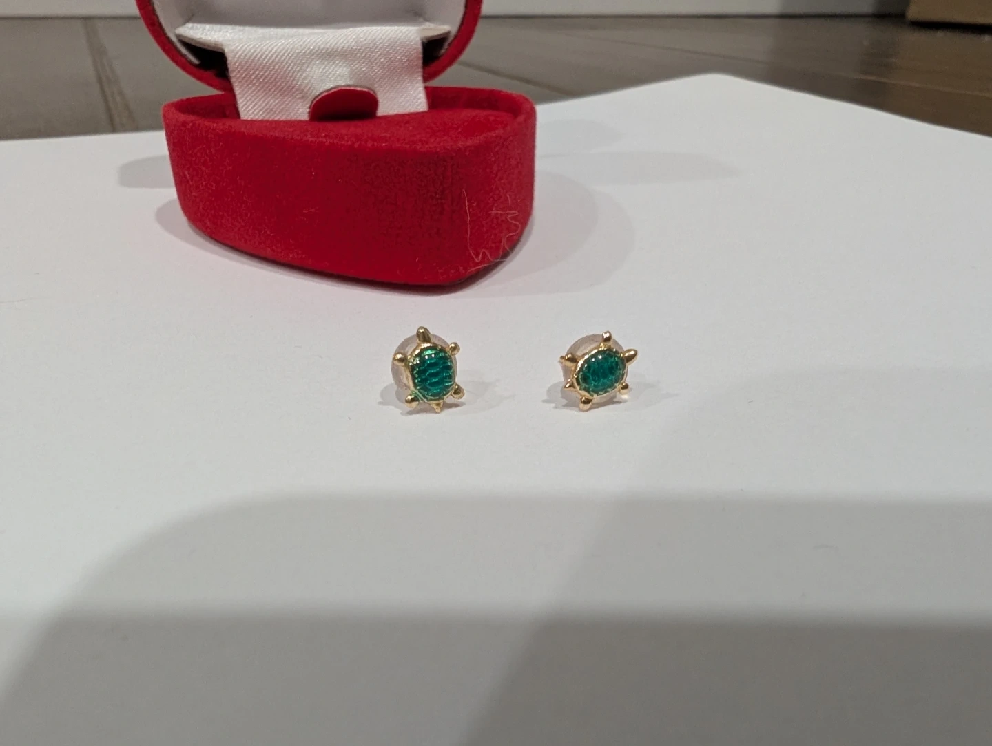 Brand new 10kt yellow gold turtle earrings for sale. Green emerald turtles studs, $160 FIRM.