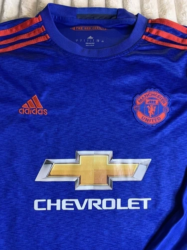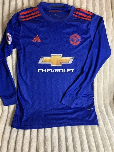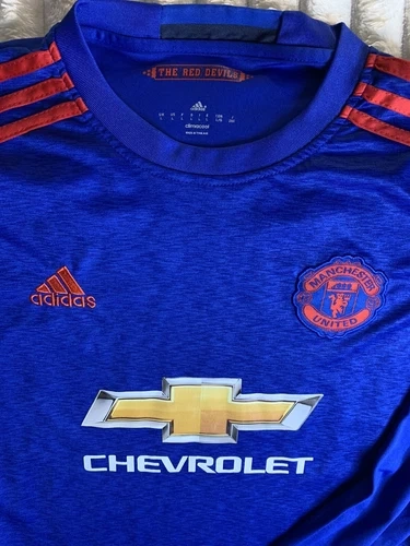 Celebrate your love for Manchester United with this officially licensed 2016/2017 away shirt by adidas. Perfect for soccer fans, this men's size LARGE jersey in blue colour is ideal for showing your support during English Premier League games. Made in Thailand, this high-quality product is a must-have for any true fan of the sport. Shirt is previously owned. One adult owner. Smoke and pet free home. The time has come for me to share my collection and offer this amazing and iconic Jersey to a true super fan of the team. All items for sale are either brand new or in excellent condition! Multiple photos are taken for all items to ensure customer satisfaction. If any defects are present, a reduction in price is made, and a description of the defect will be in the description area. Thank you for your consideration! Please keep in touch with me by messaging with any questions or concerns, and I will reply promptly.