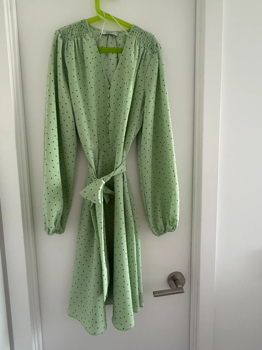 Selling a new Suzy dress in a lovely green colour with a polka dot pattern! It's a size medium and features a tie at the waist.