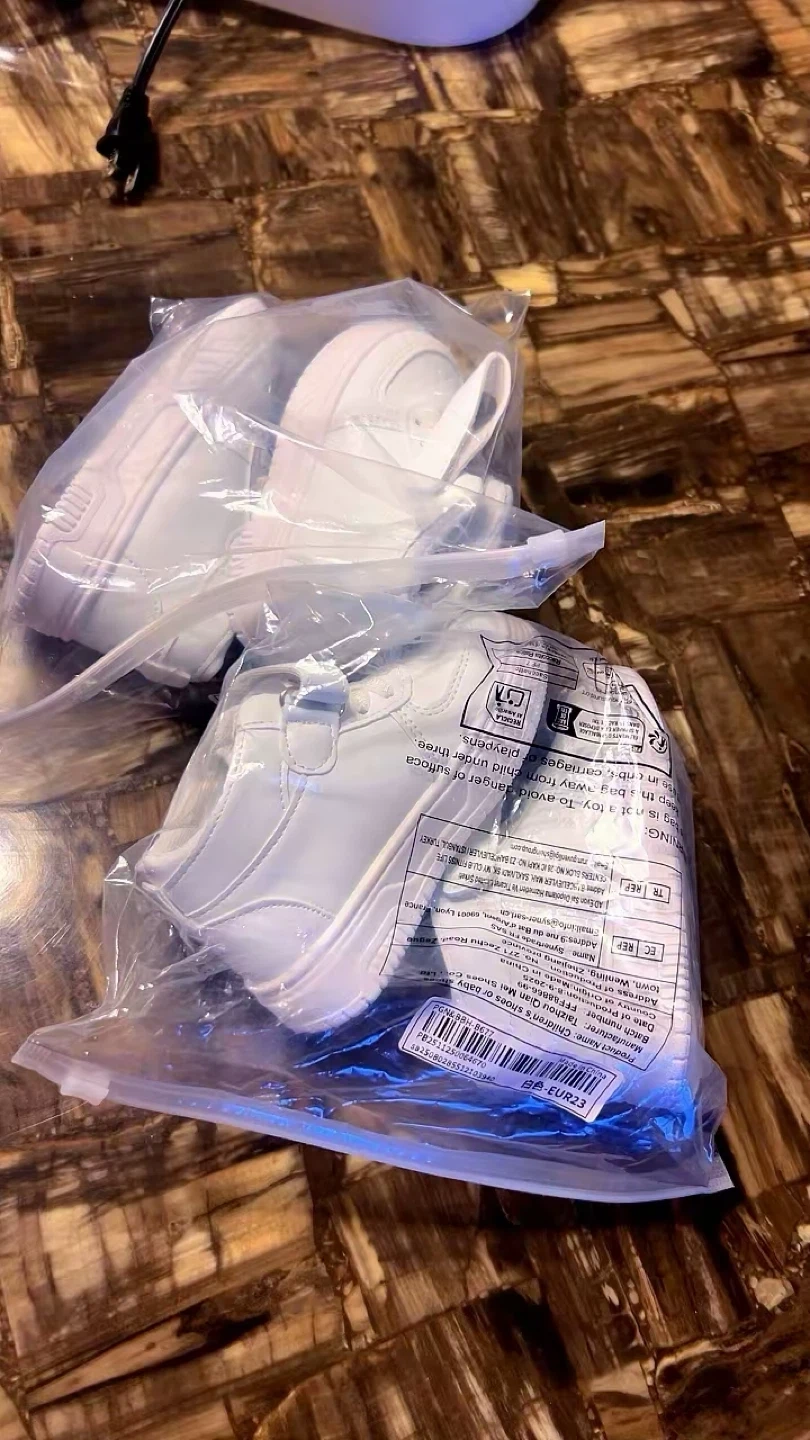 Selling a pair of children's shoes in white, size EUR23. They're still in the original packaging. The manufacturing date is 2025 August 09, so they're brand new!