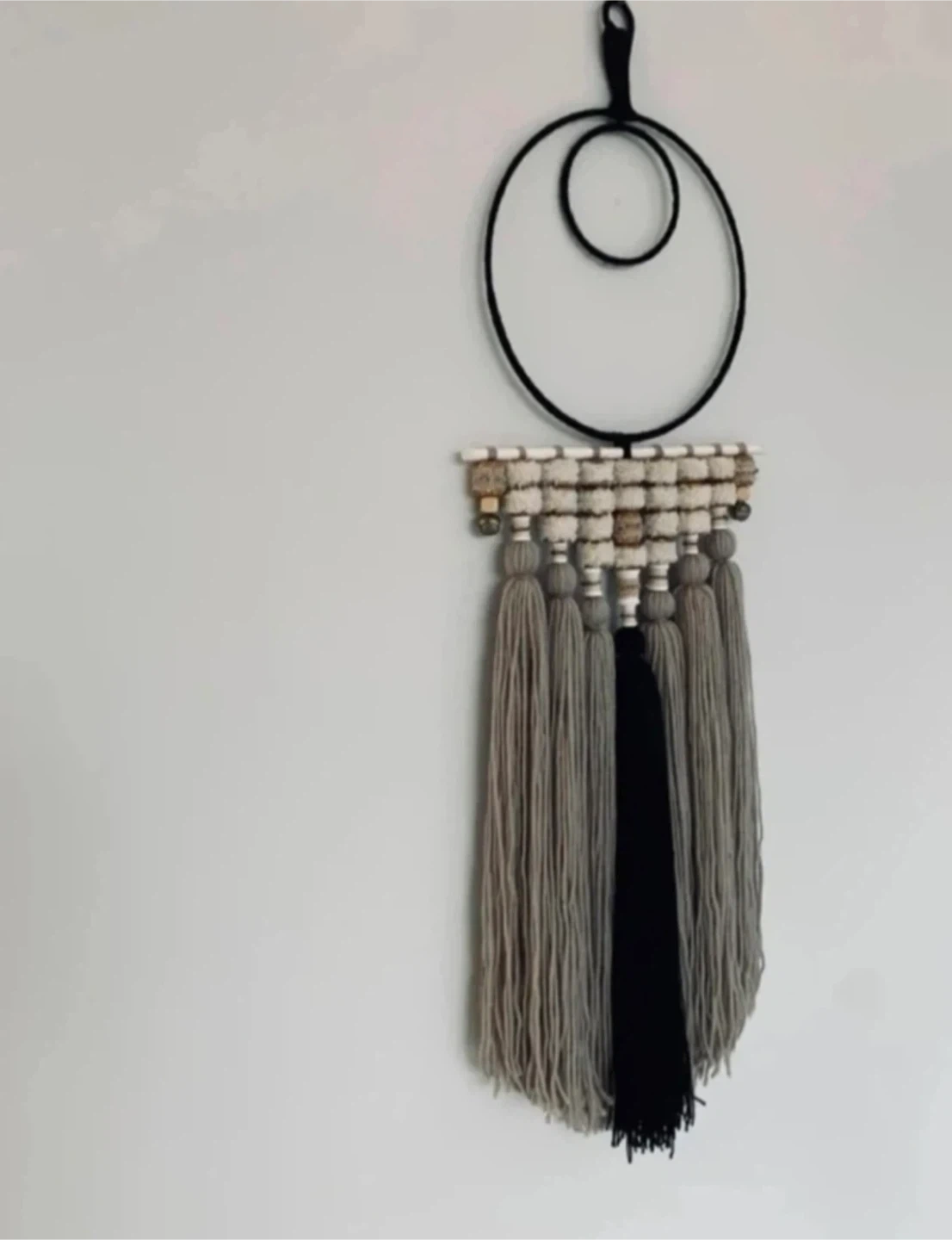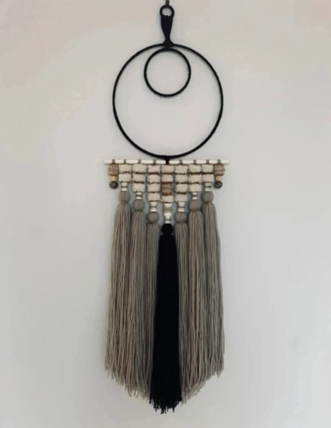 •Featuring a palette of neutral shades and hand-made wooden bead accents, this piece offers natural warmth and serene beauty. A lovely addition to any room.