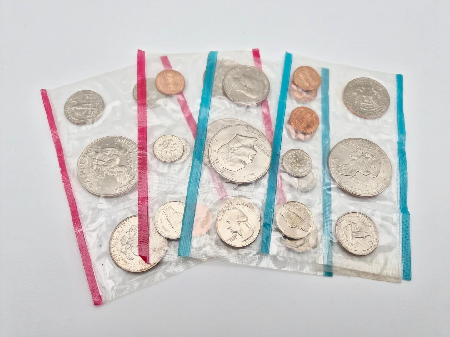 This is an uncirculated set of US 1973 coins, including pennies, dimes, quarters, and half dollars, all sealed in original packaging. The coins appear to be from the mid-20th century. It's a nice way to collect American currency!