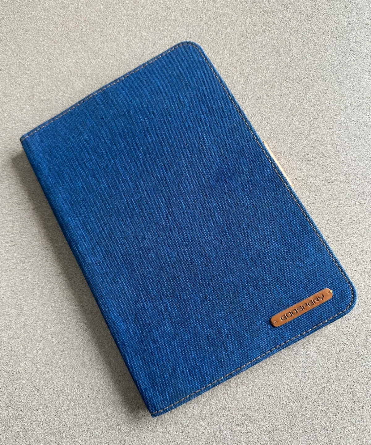 This Gootery tablet case comes in a stylish blue denim finish with brown faux leather accents. It features convenient card slots inside the flap for easy access. Protect your tablet with this durable and fashionable case!