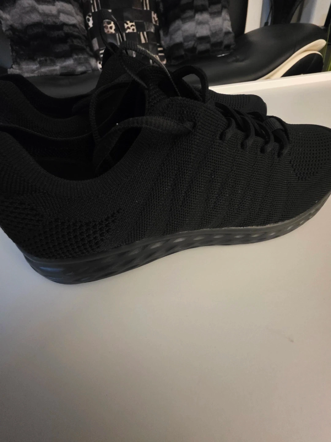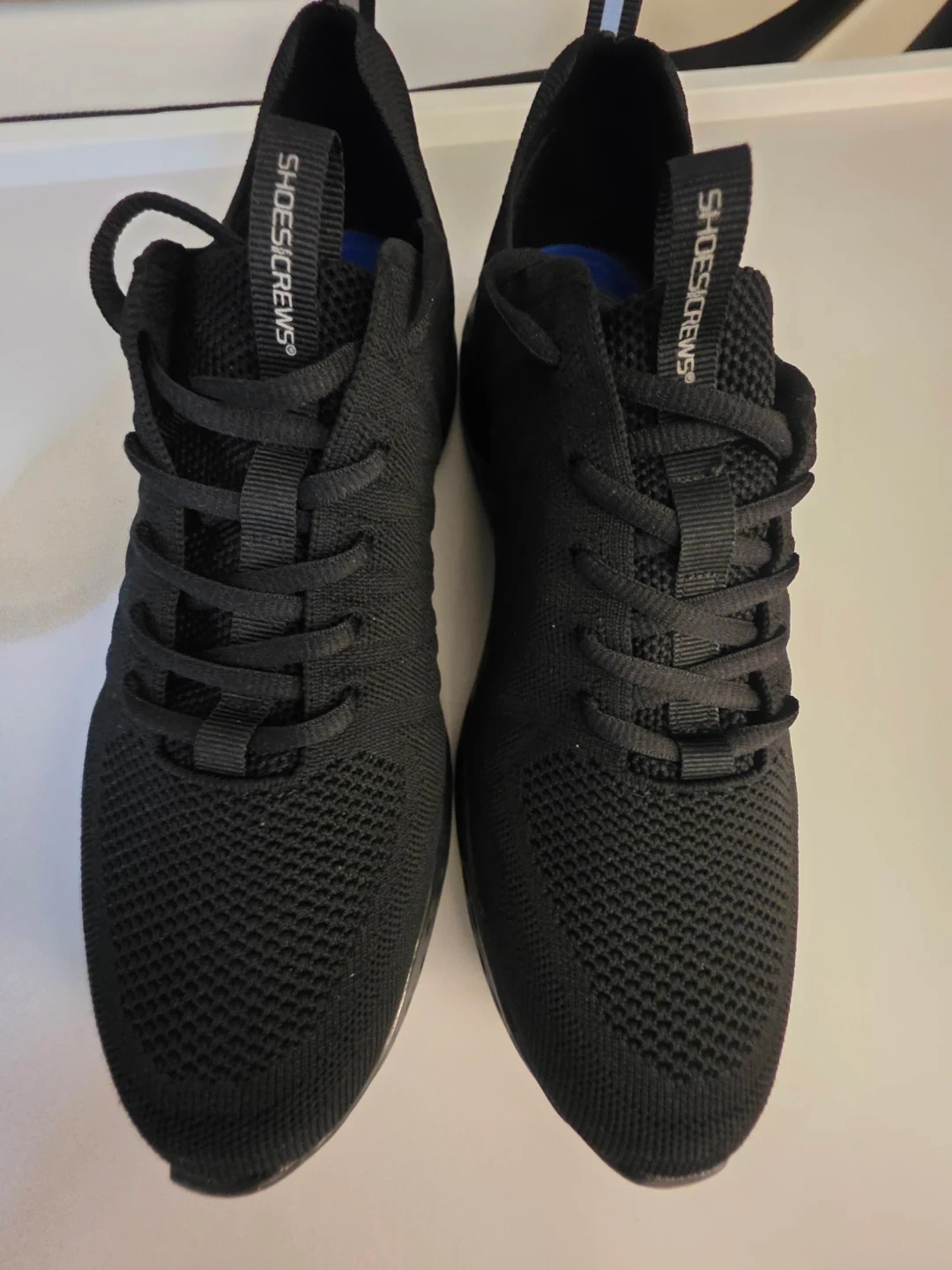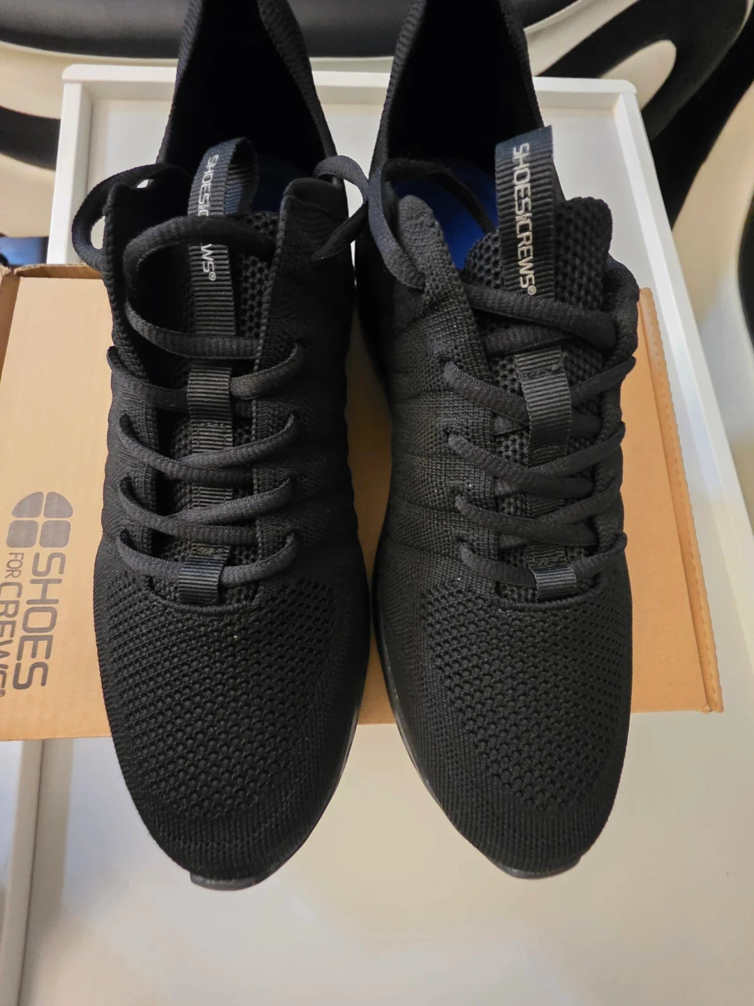 These Shoes for Crews athletic shoes are black and feature a breathable knit upper. They have a comfortable design perfect for everyday wear. The durable sole provides good traction. These shoes would be great for casual outings or light activity!