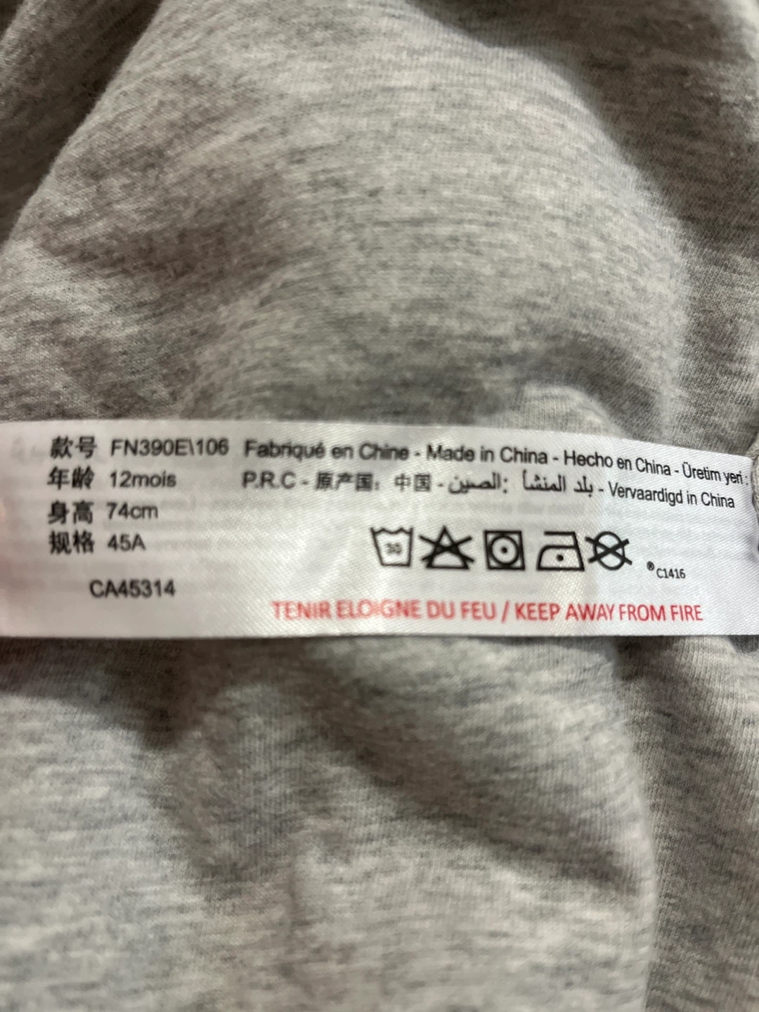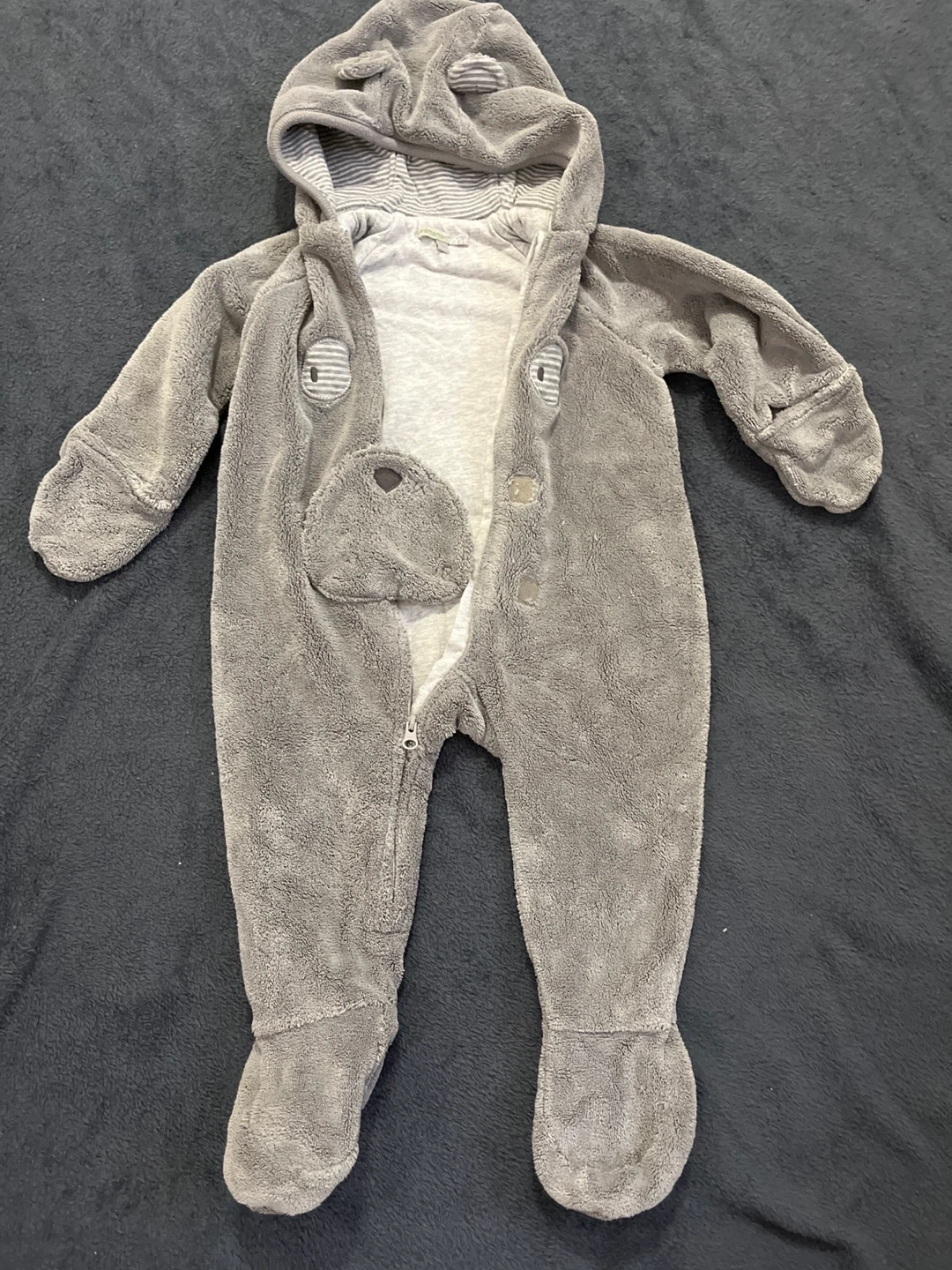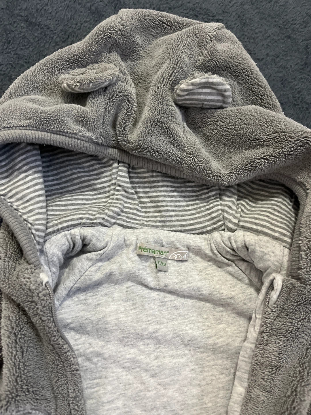 92Super cute PréMaman bear onesie! It's a soft, fuzzy grey and perfect for keeping your little one cozy. The size is 12 months.