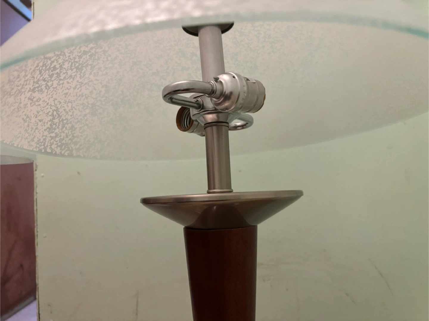 This pair of table lamps features frosted glass shades and a wood and metal base. They're about 23 inches tall. They would look nice on side tables or nightstands.