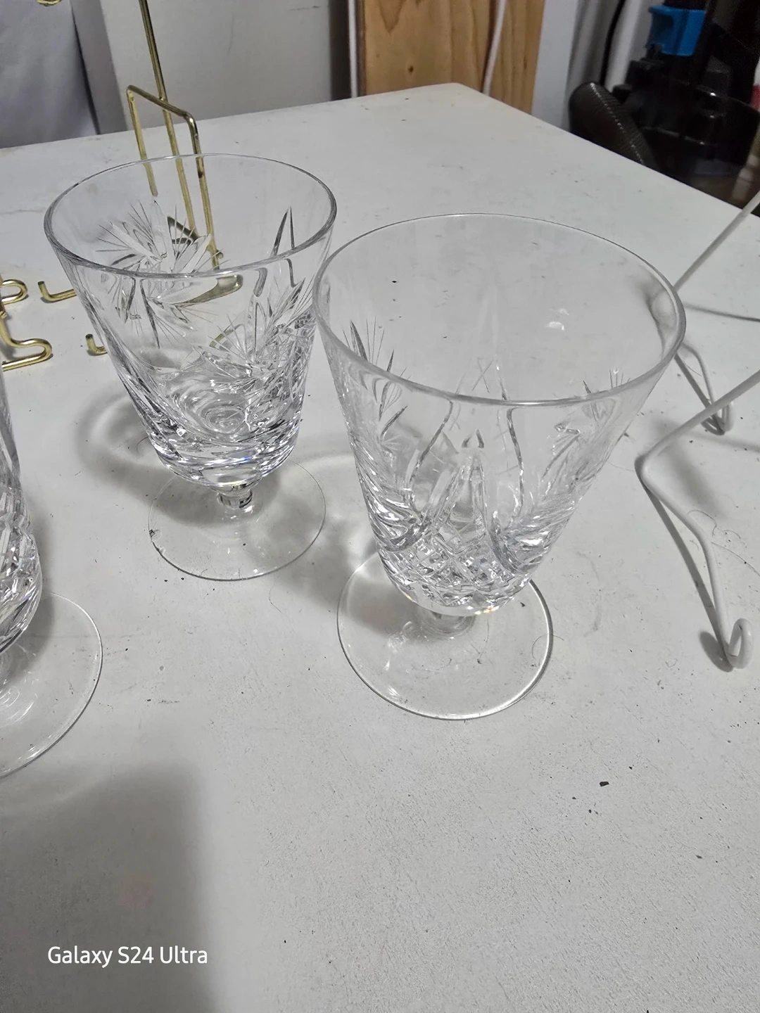Set of elegant crystal glasses featuring a detailed cut glass pattern. These glasses add a touch of sparkle to any table setting. Perfect for enjoying your favourite beverages during special occasions! Pinwheel pattern