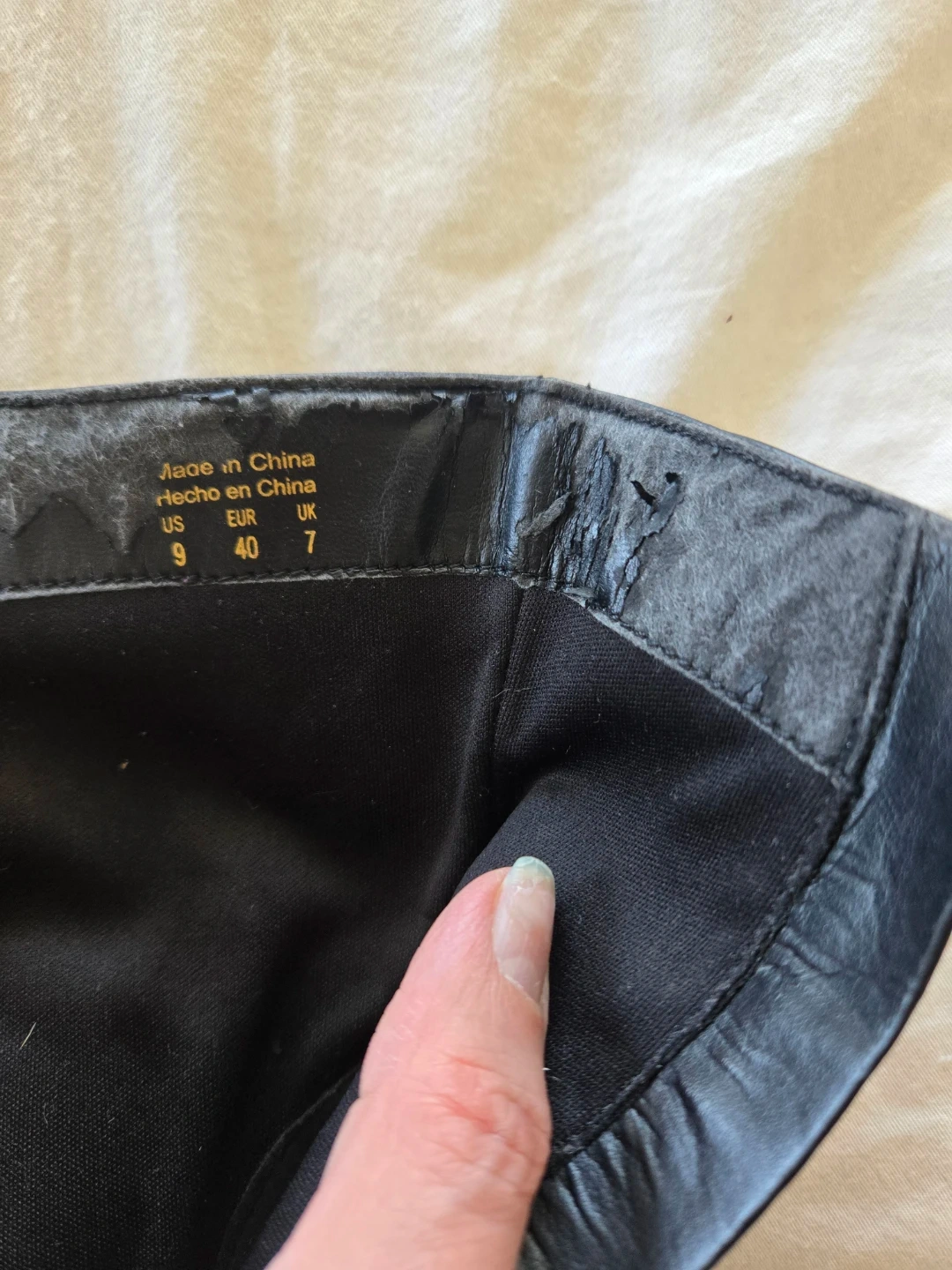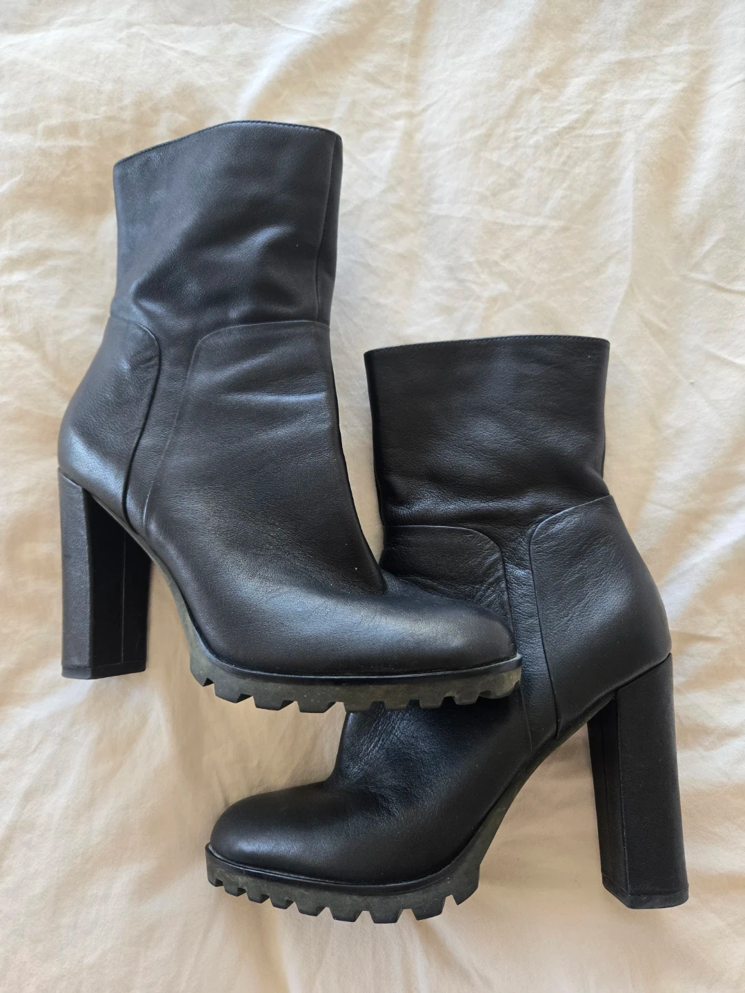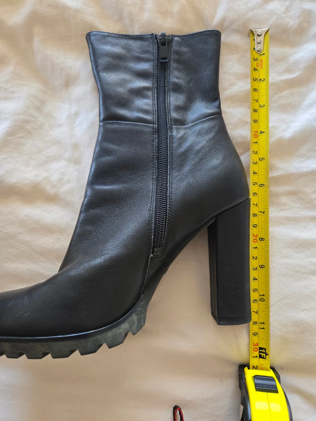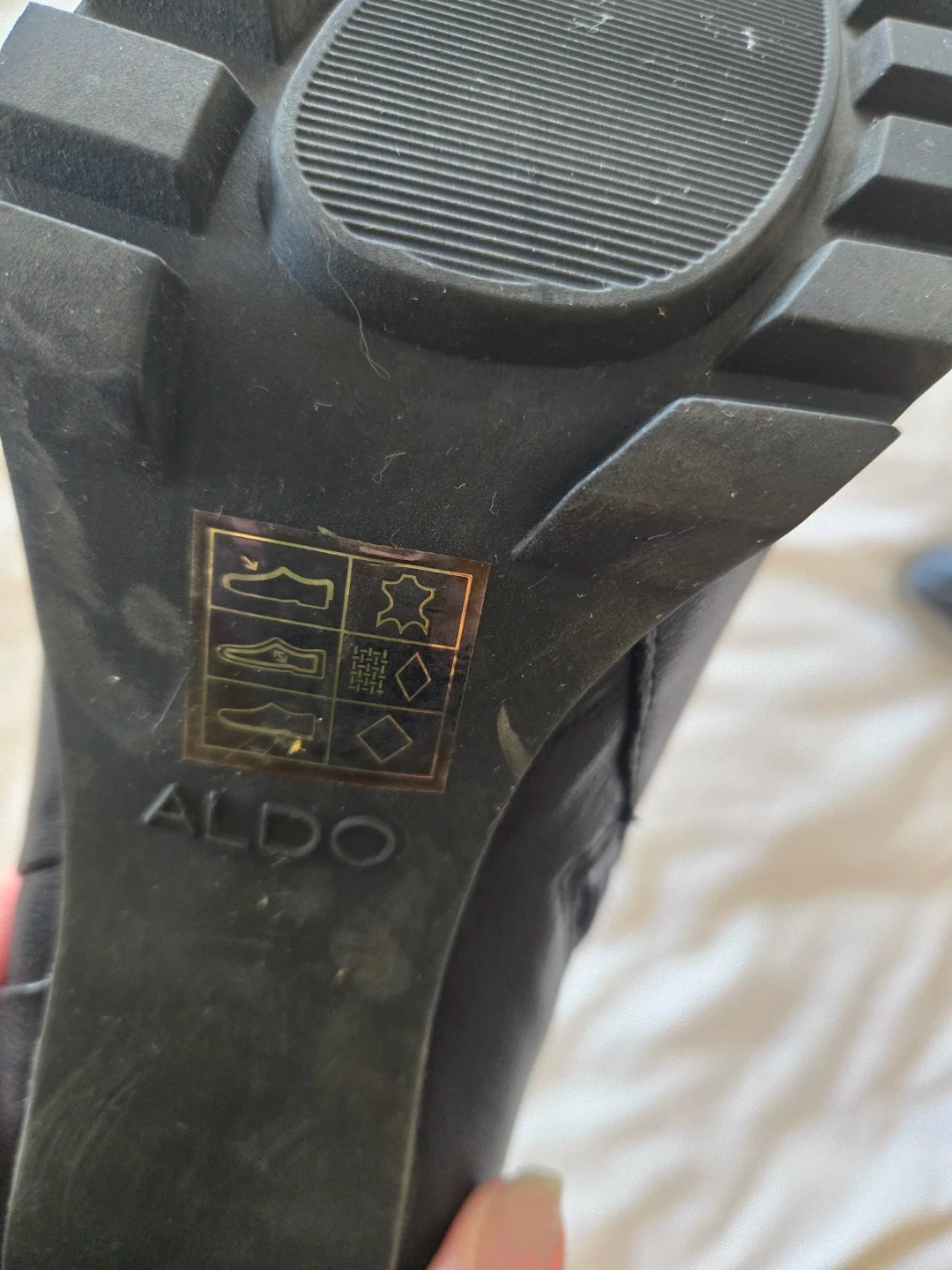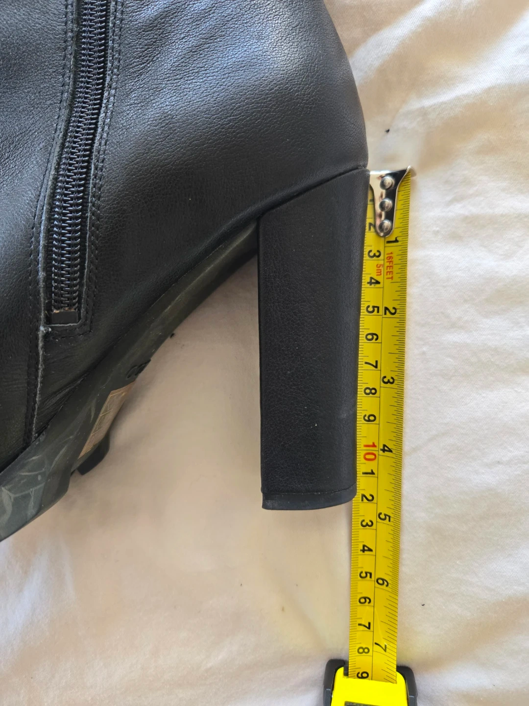 ALDO black leather ankle boots with a block heel and side zipper. These boots are a size US 9, EUR 40, UK 7. The heel height is approximately 12 cm.