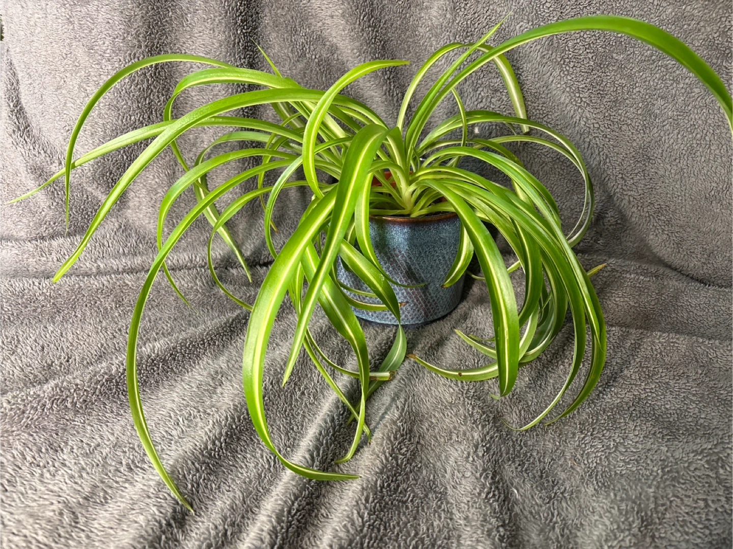 Healthy spider plant with long, arching leaves. Comes in a textured blue ceramic pot. Great for adding a touch of green to any space!