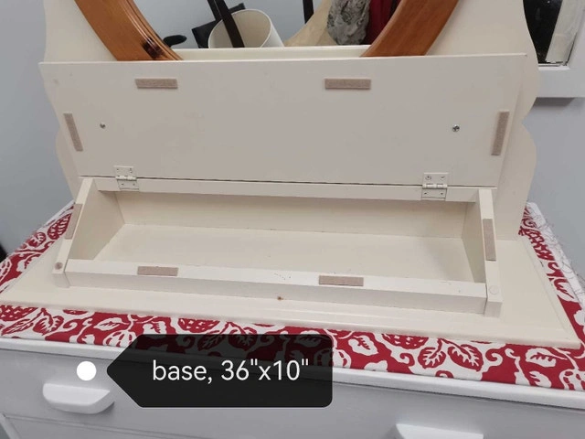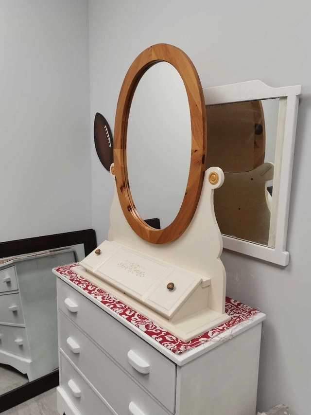 This is a charming vanity mirror with a wooden frame, perfect for adding a touch of elegance to any bedroom or dressing area. The mirror is in good condition, ready to be the spotlight of your morning routine. It features a storage compartment beneath the mirror. size shown it's time for this beauty to find a new home. If the ad is up, the vanity mirror is available, so don't hesitate to reach out!