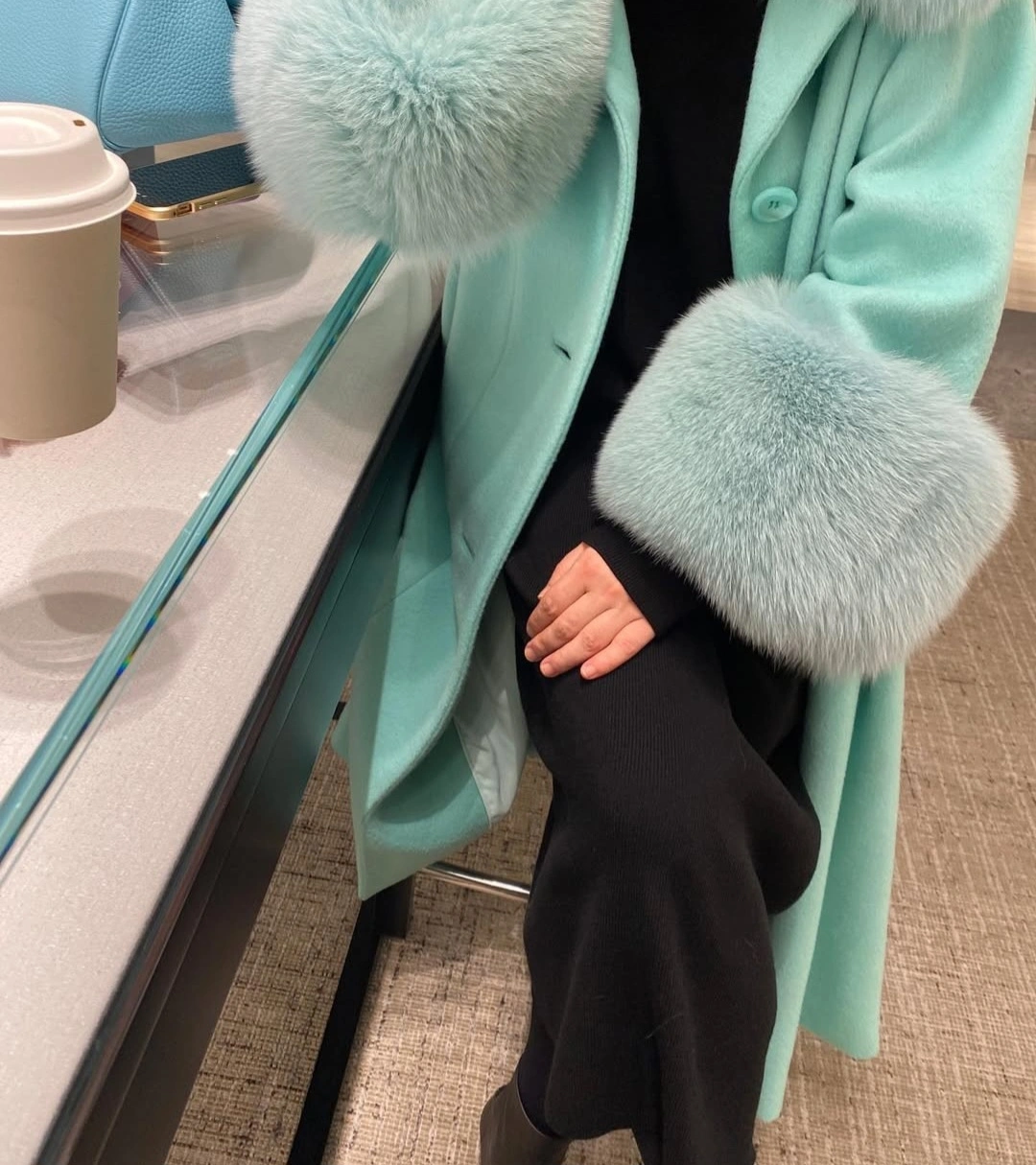 Mint Green Wool -Blend Coat with Genuine Saga Fox Fur