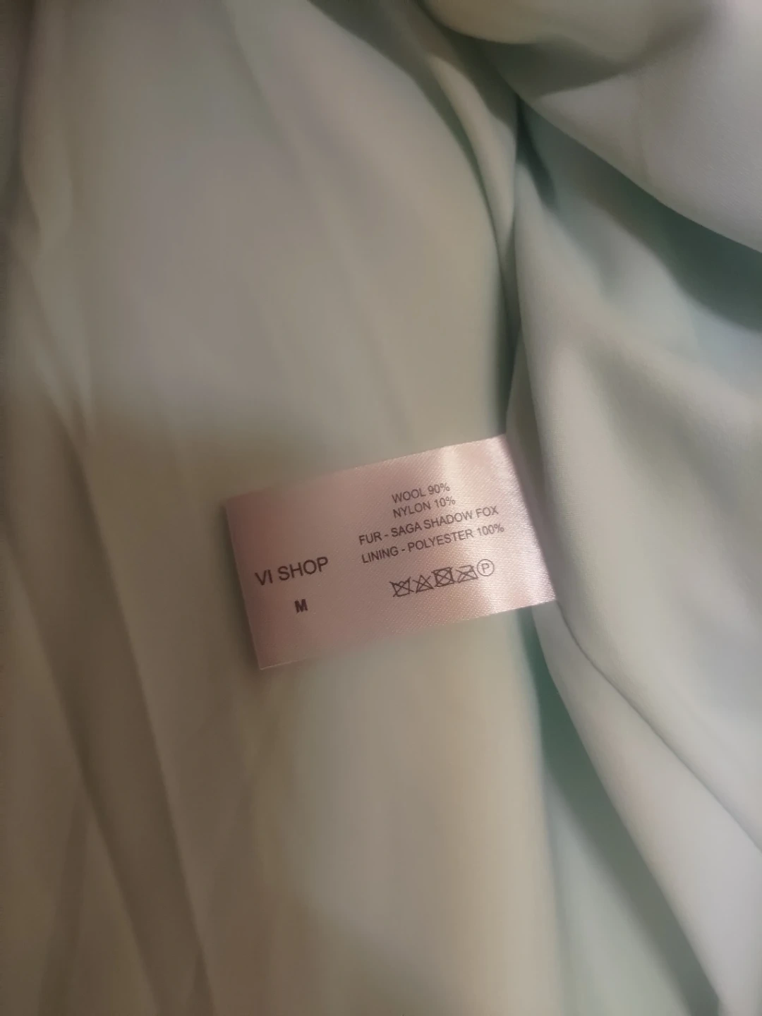 Absolutely gorgeous mint coat featuring luxurious genuine Saga Fox fur on the collar and cuffs.