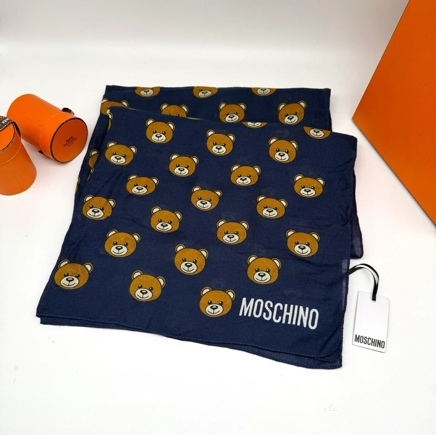 Check out this brand new Moschino scarf! It's a beautiful navy colour with an adorable teddy bear print. The material is 92% modal and 8% cashmere, making it super soft and cozy. Perfect for adding a touch of luxury to any outfit