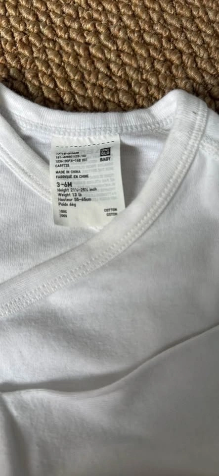 Selling 2 rarely used Uniqlo baby crossover bodysuits in white, size 3–6 months. These are great basics for layering, sleepwear, under sweaters or sleep sacks, and easy everyday changes. Details: Uniqlo Baby, Size 3–6M, 100% cotton, long sleeve, crossover / side snap style. Soft and simple baby essentials.