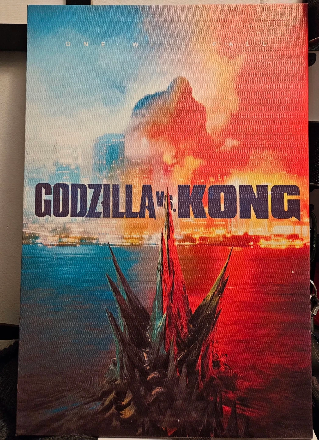 This is a canvas print featuring artwork from the movie Godzilla vs. Kong. It shows the epic battle scene between the two titans with a city skyline in the background. A cool piece for any monster movie fan!