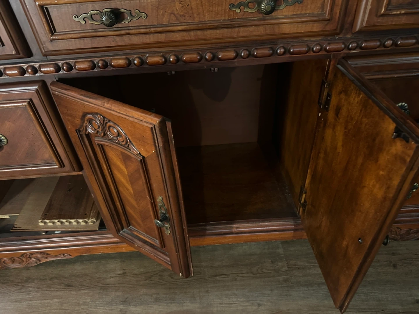 A lovely vintage wooden dresser with lots of storage. It features multiple drawers and cabinet space. The wood has a rich, warm tone and the hardware is ornate and classic. Perfect for adding a touch of elegance to any room