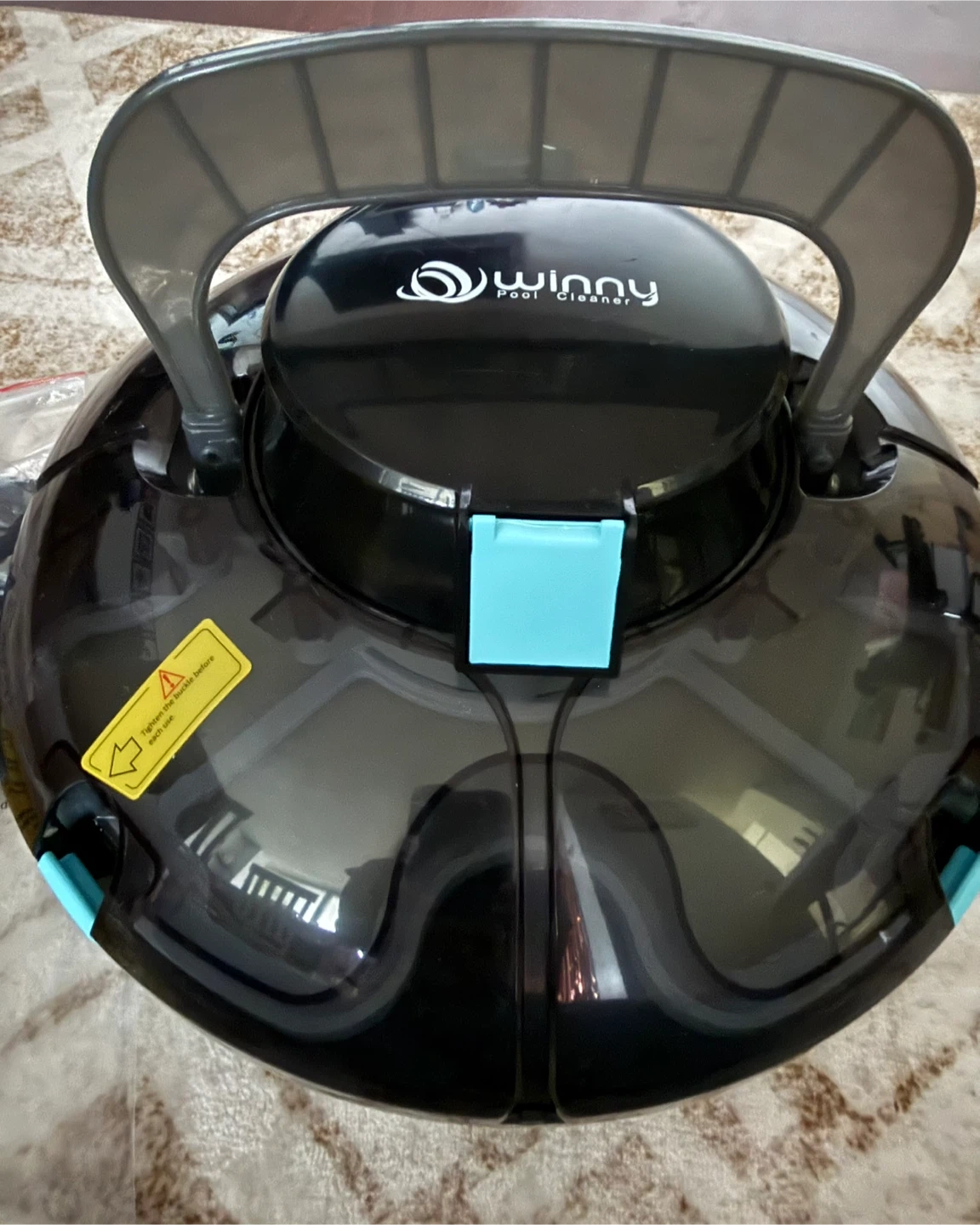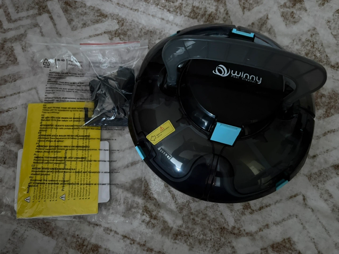 This is a Winny 200 cordless robotic pool cleaner. It's black and includes the original box and accessories. This cleaner is designed to efficiently clean your pool.