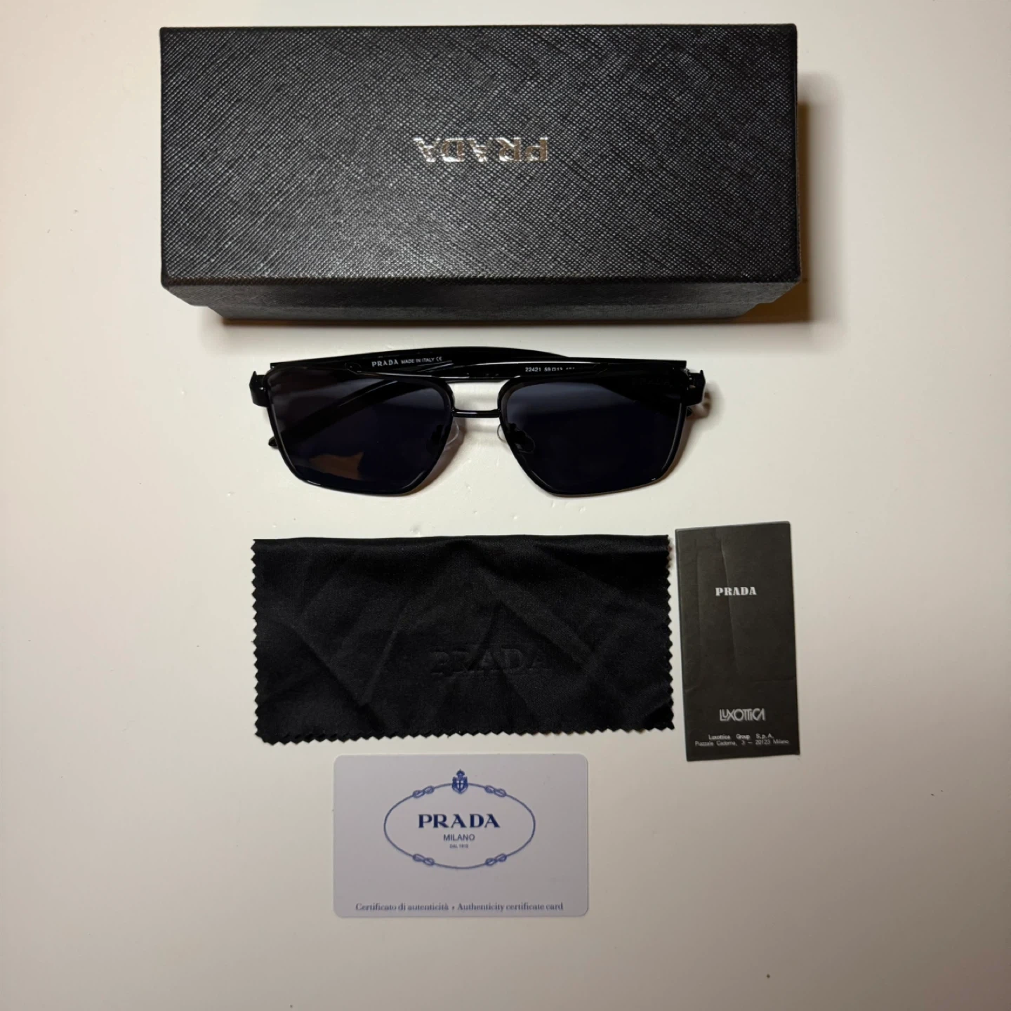 Selling a pair of Prada sunglasses, model 22421. They are in great condition and come with the original box, a cleaning cloth, and an authenticity card! The sunglasses are black and have the measurements 59 [] 13 138 on the side