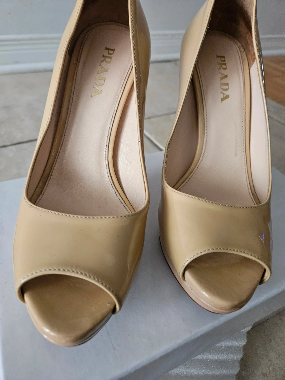 10Selling a pair of Prada heels in a beautiful beige patent leather! They are a size 37.5. There are some signs of wear, as shown in the photos, but they still have lots of life left. Perfect for adding a touch of luxury to your wardrobe! It will be good for a narrow leg.