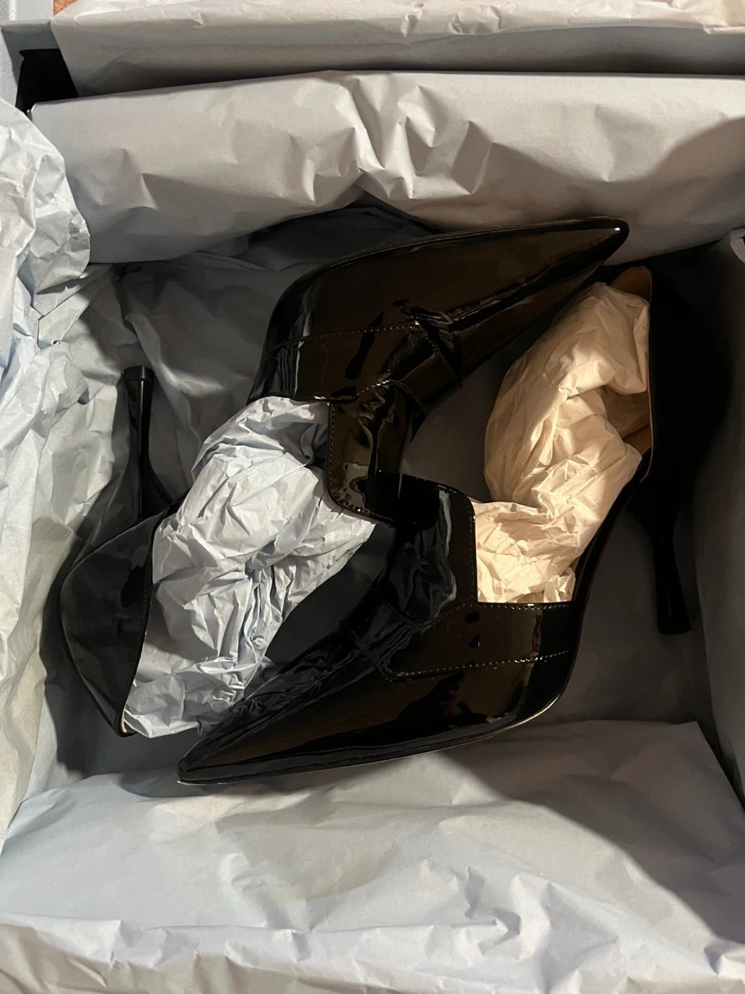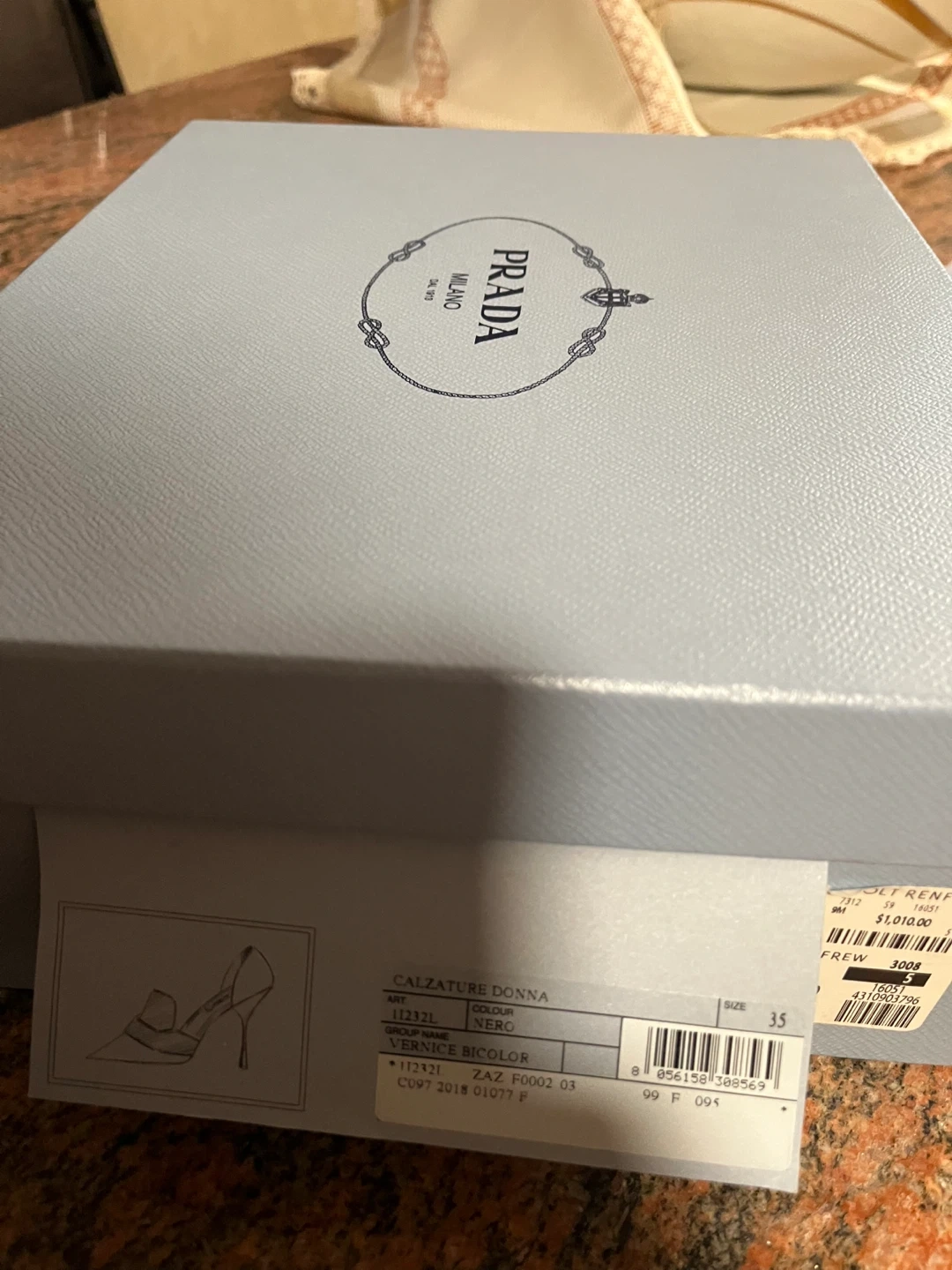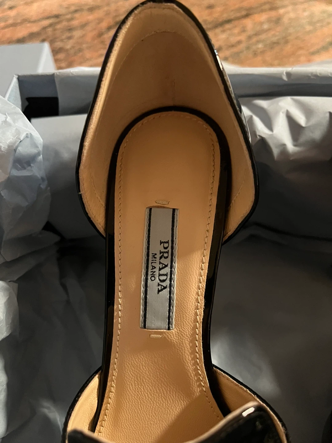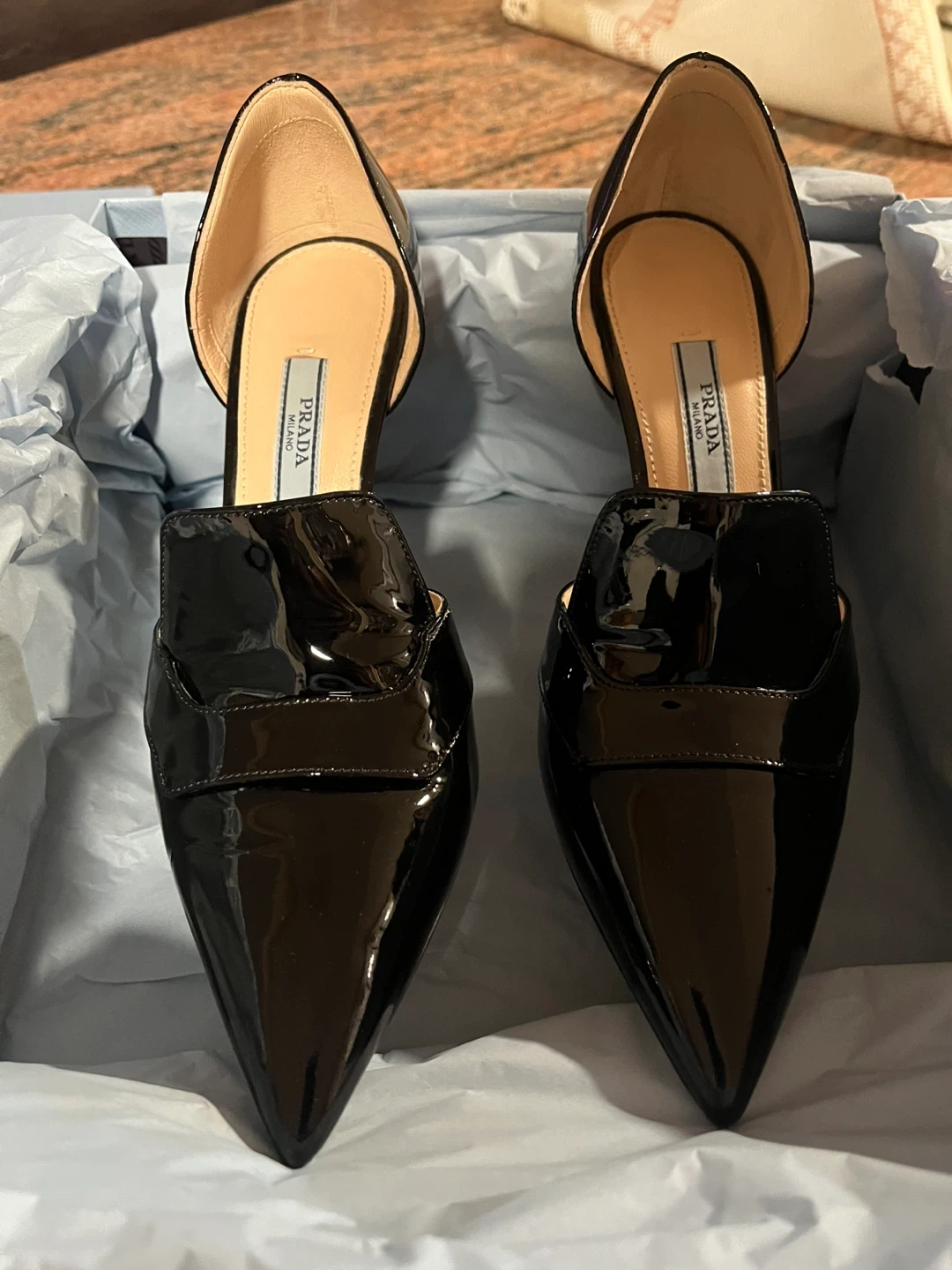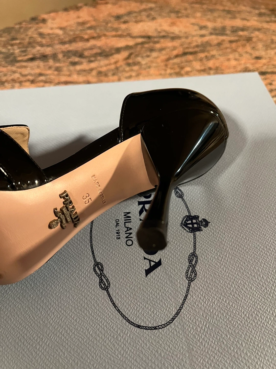 Selling a pair of Prada heels in size 35. They are made of black patent leather and come with the original box!