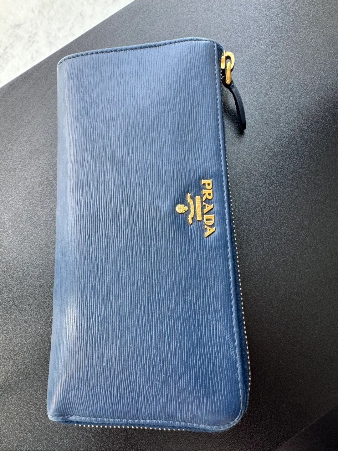 28Here's a stylish Prada wallet in a lovely shade of blue! It's made of leather and has a zip closure.