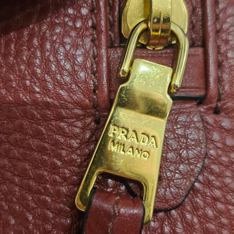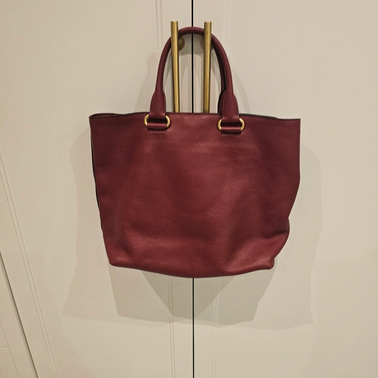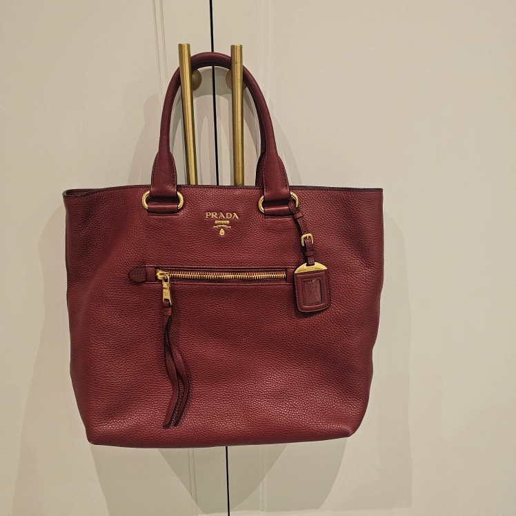 41Selling a beautiful Prada Milano leather tote bag in a rich burgundy colour. It's in great condition and perfect for everyday use. The bag features gold-tone hardware and a spacious interior. It can be carried as a tote or worn as a crossbody with the detachable strap