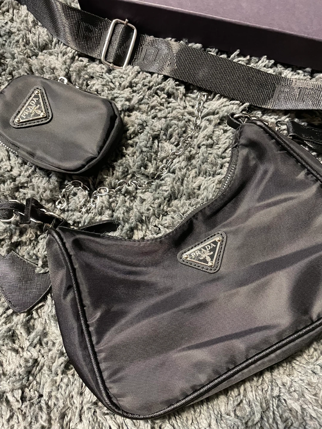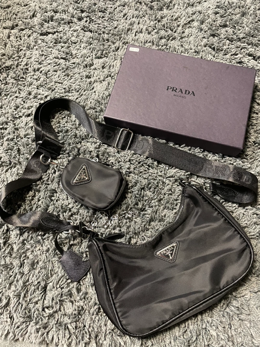 Selling a stylish Prada Re-Edition 2000 mini bag in black nylon, complete with a matching coin purse! Comes with its original box and strap. This iconic bag is perfect for adding a touch of luxury to any outfit Comes with provider box!
