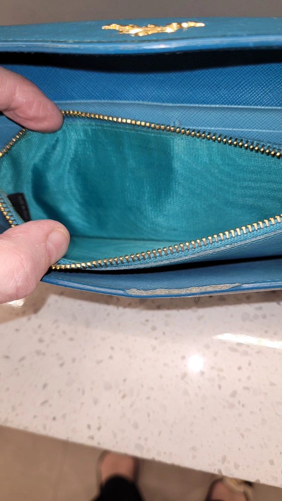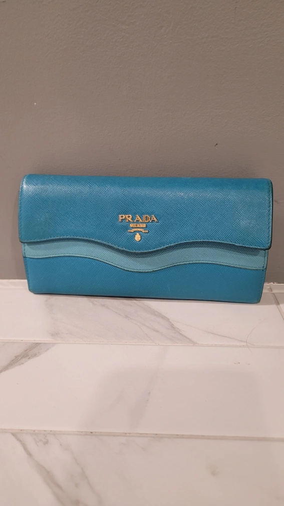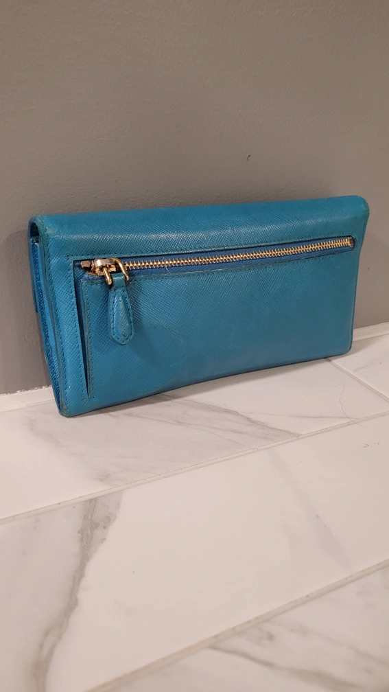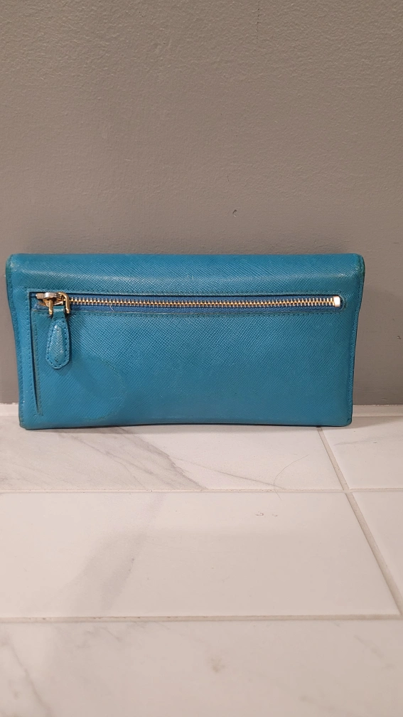 484Blue leather wallet with gold hardware. Some wear on the corners. Authentic