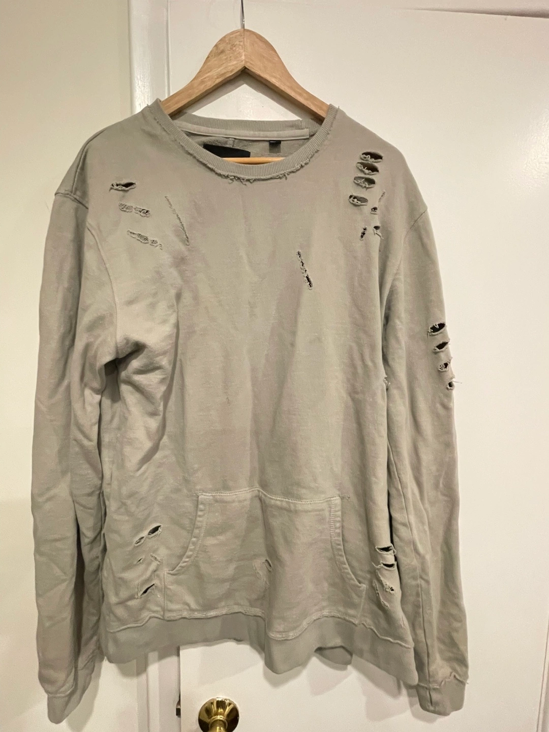 Light grey sweatshirt. Features intentional distressing throughout. Long sleeves, crew neck. Good condition.