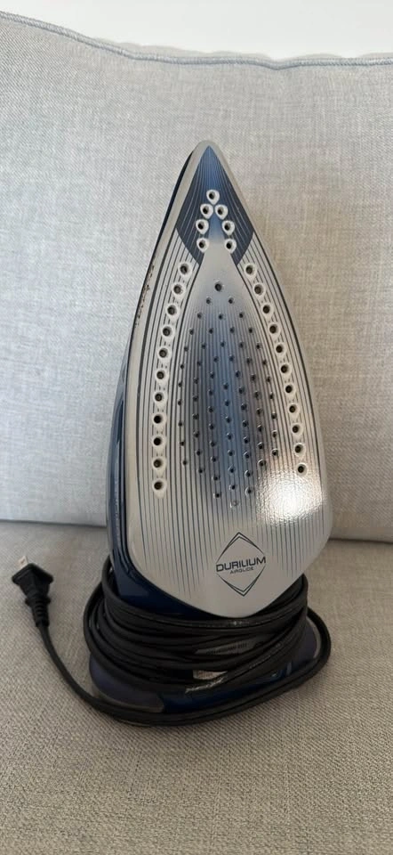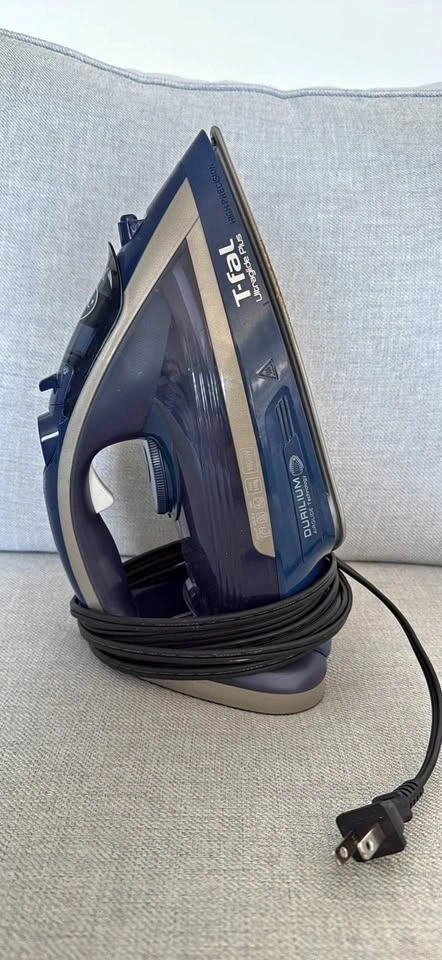 Efficient T-fal Ultraglide Plus steam iron with Durilium Airglide Technology for smooth gliding. Blue and gray color. The mist button is malfunctioning and may be fixable.