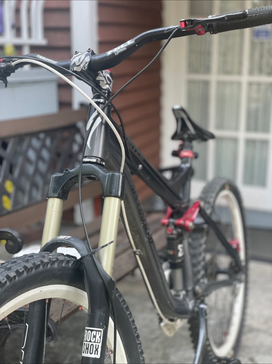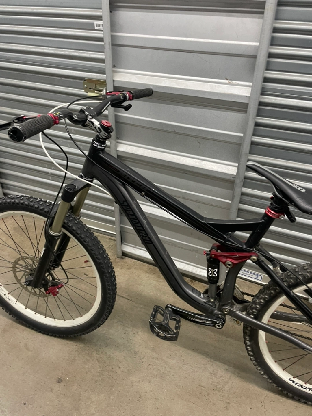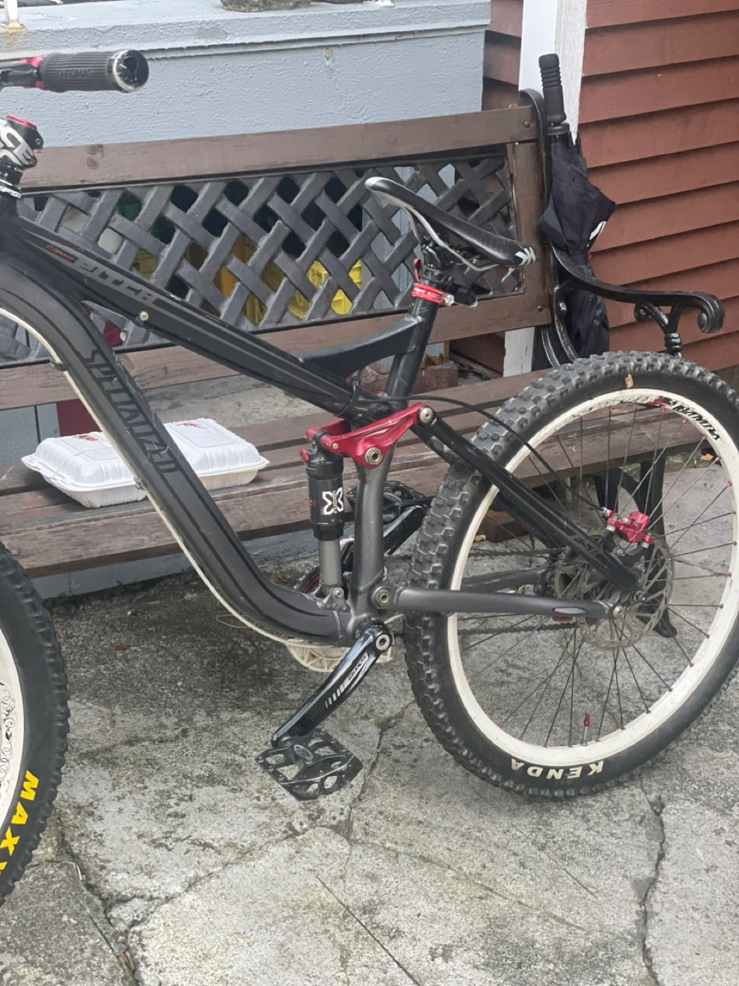 10Specialized Stumpjumper FSR mountain bike. RockShox fork and rear shock. SRAM X5 shifters and Bengal Helix 2 brakes. Maxxis and Kenda tires.