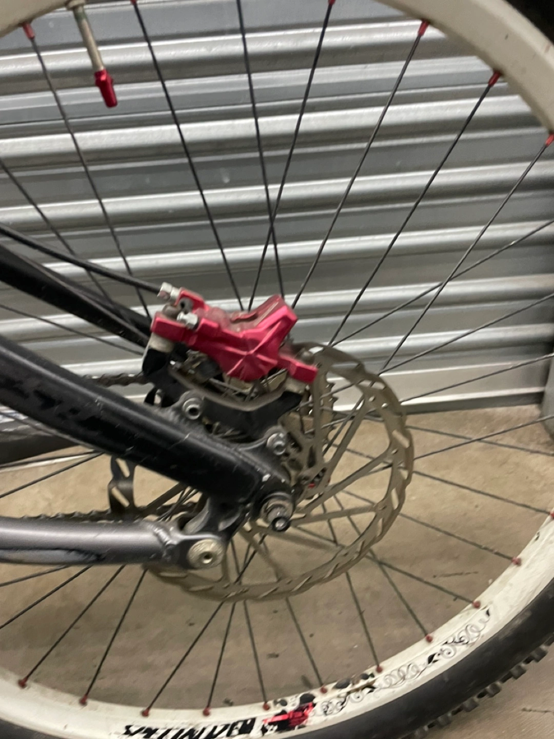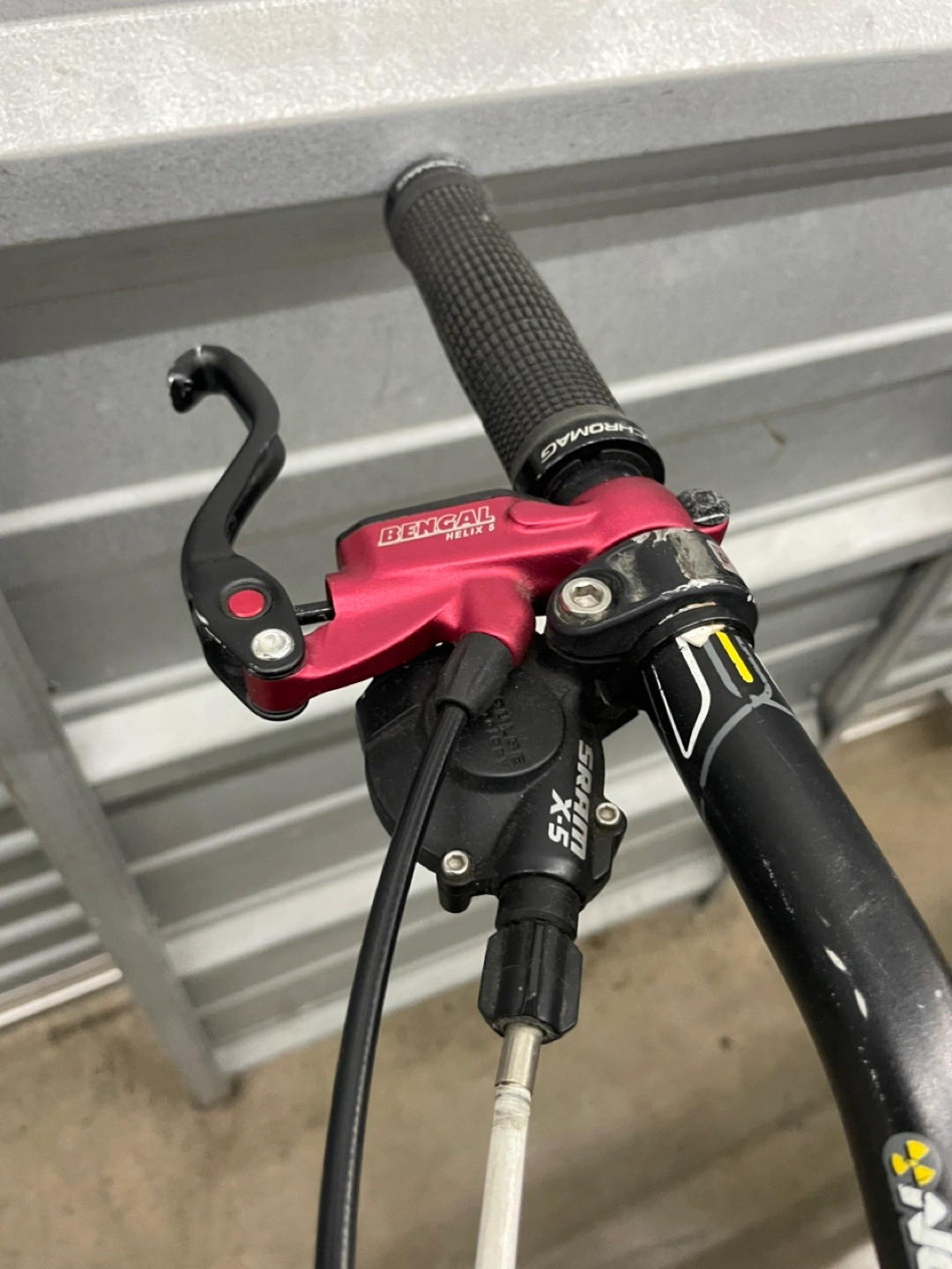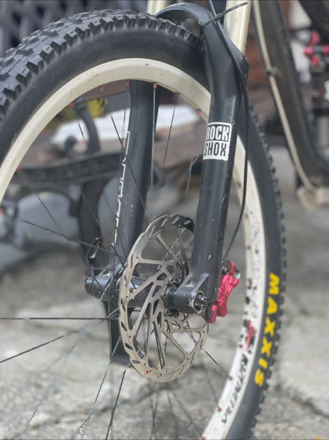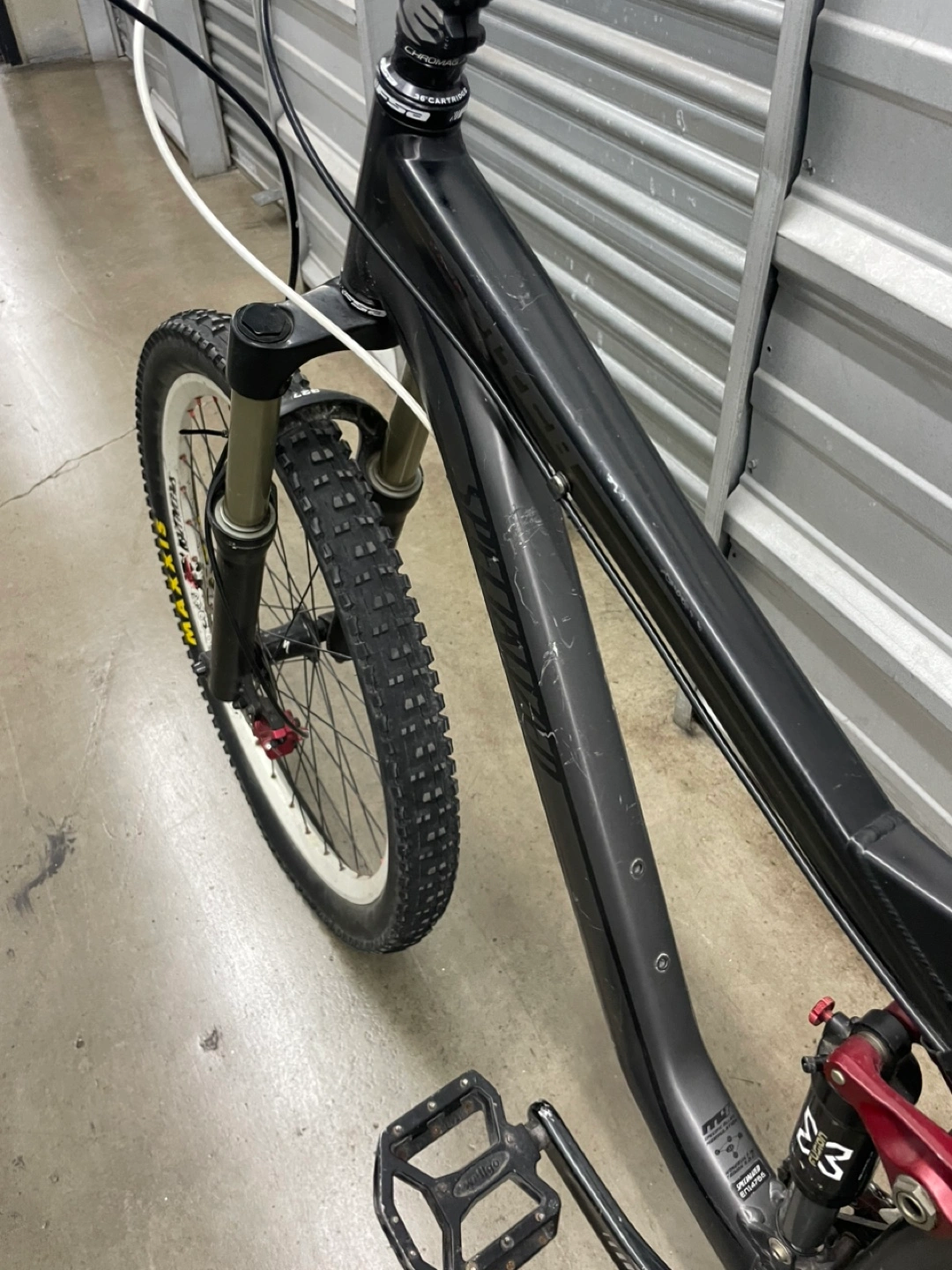 10Specialized Stumpjumper FSR mountain bike. RockShox fork and rear shock. SRAM X5 shifters and Bengal Helix 2 brakes. Maxxis and Kenda tires.