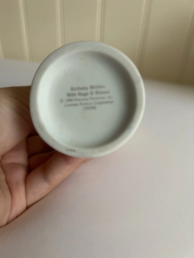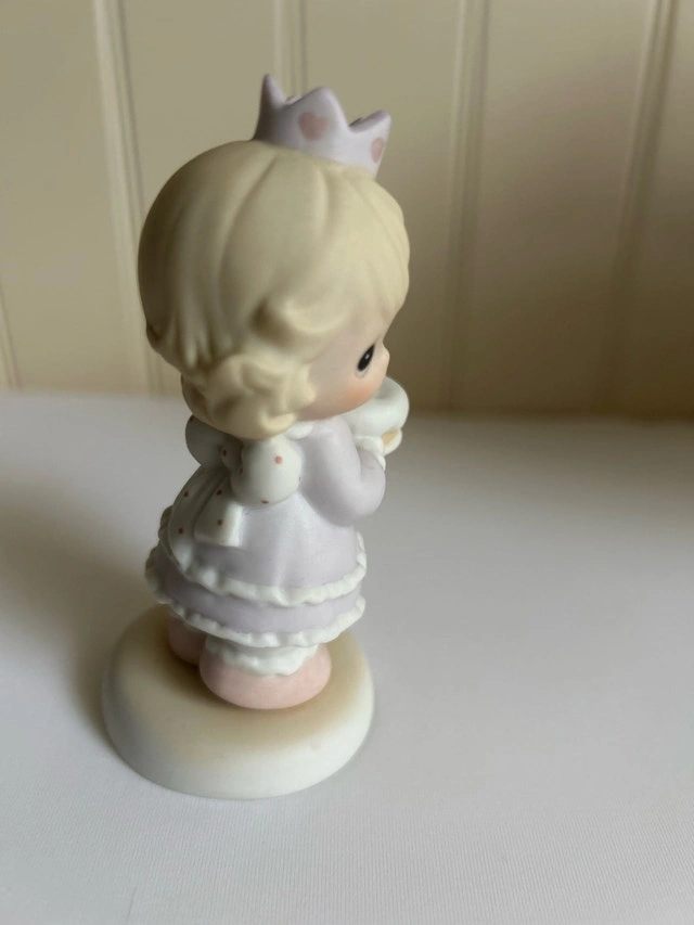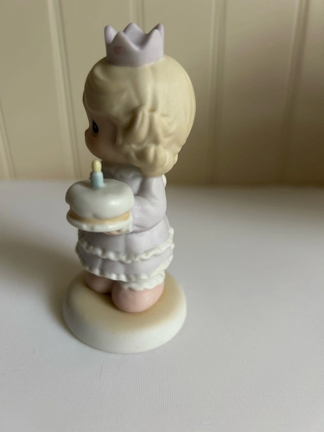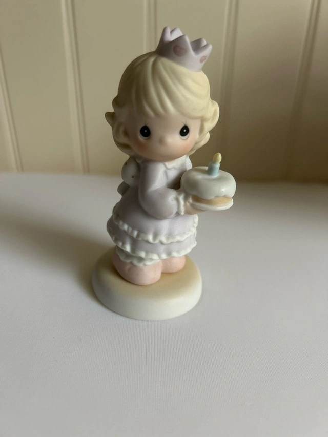 15This is a Precious Moments figurine, titled 'Birthday Wishes, With Hugs and Kisses', and is from 1996. This figurine features a sweet little girl with a crown, holding a birthday cake with a single candle. It's in good condition for its age, with no visible chips or cracks. This would be a charming addition to any Precious Moments collection or a thoughtful birthday gift! I've priced it at $15, which reflects its vintage and condition.