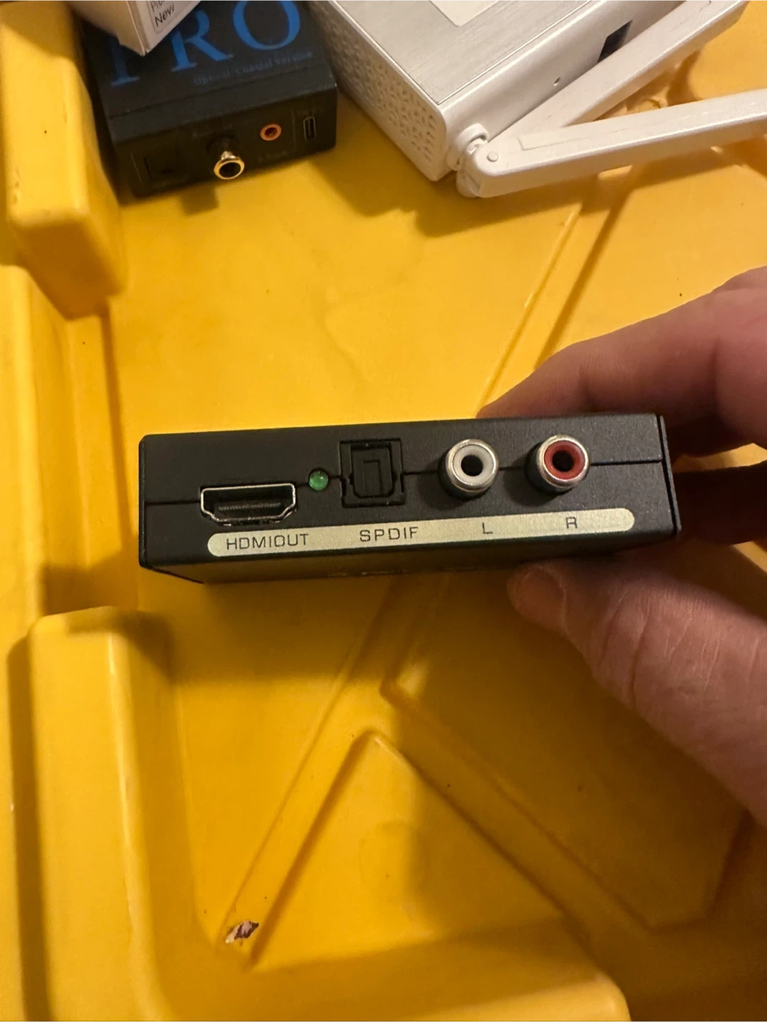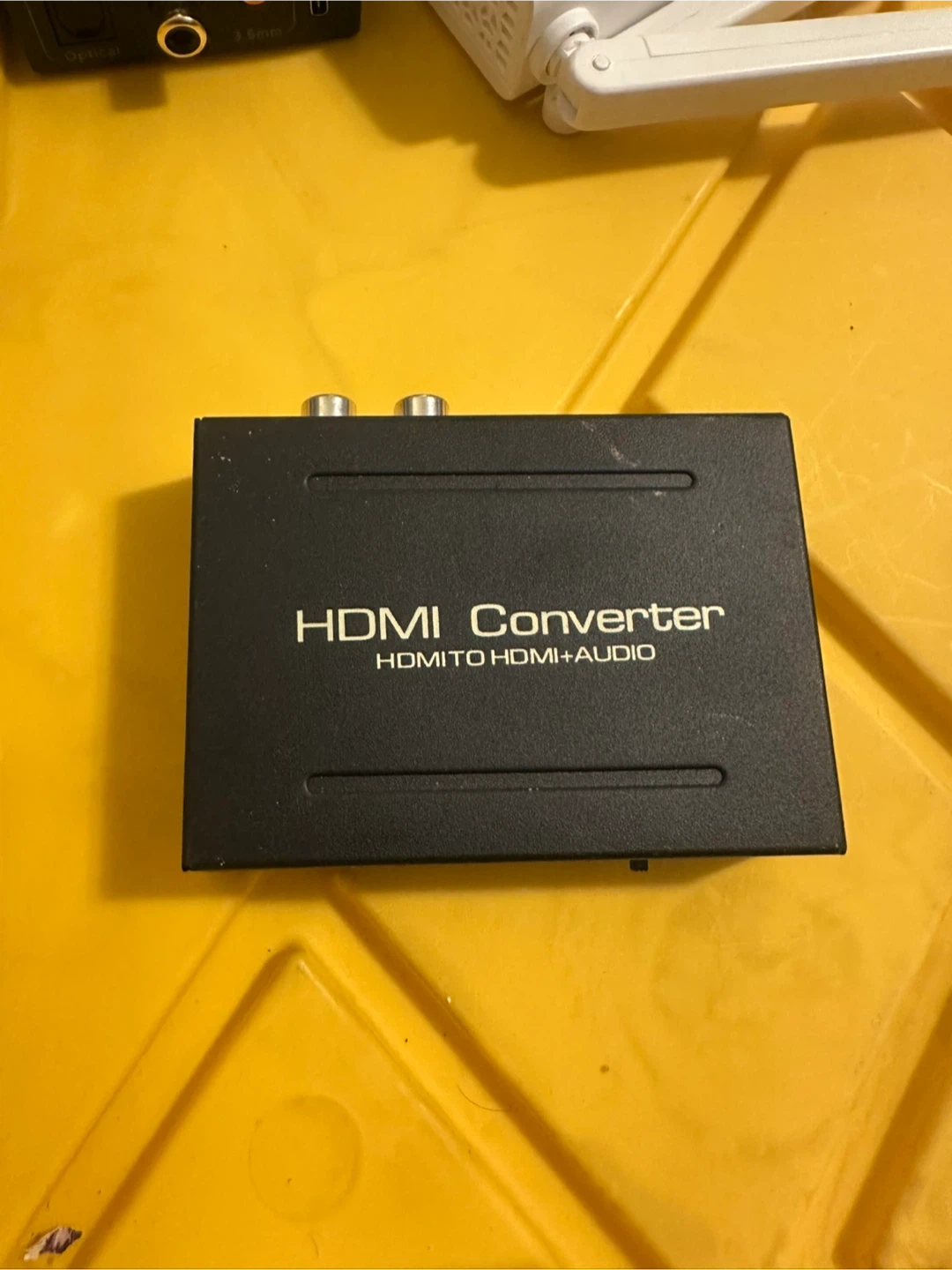 This is an HDMI converter that outputs HDMI and audio. It has an HDMI OUT port. It also supports SPDIF and L/R audio outputs. It's useful for splitting audio from an HDMI signal.