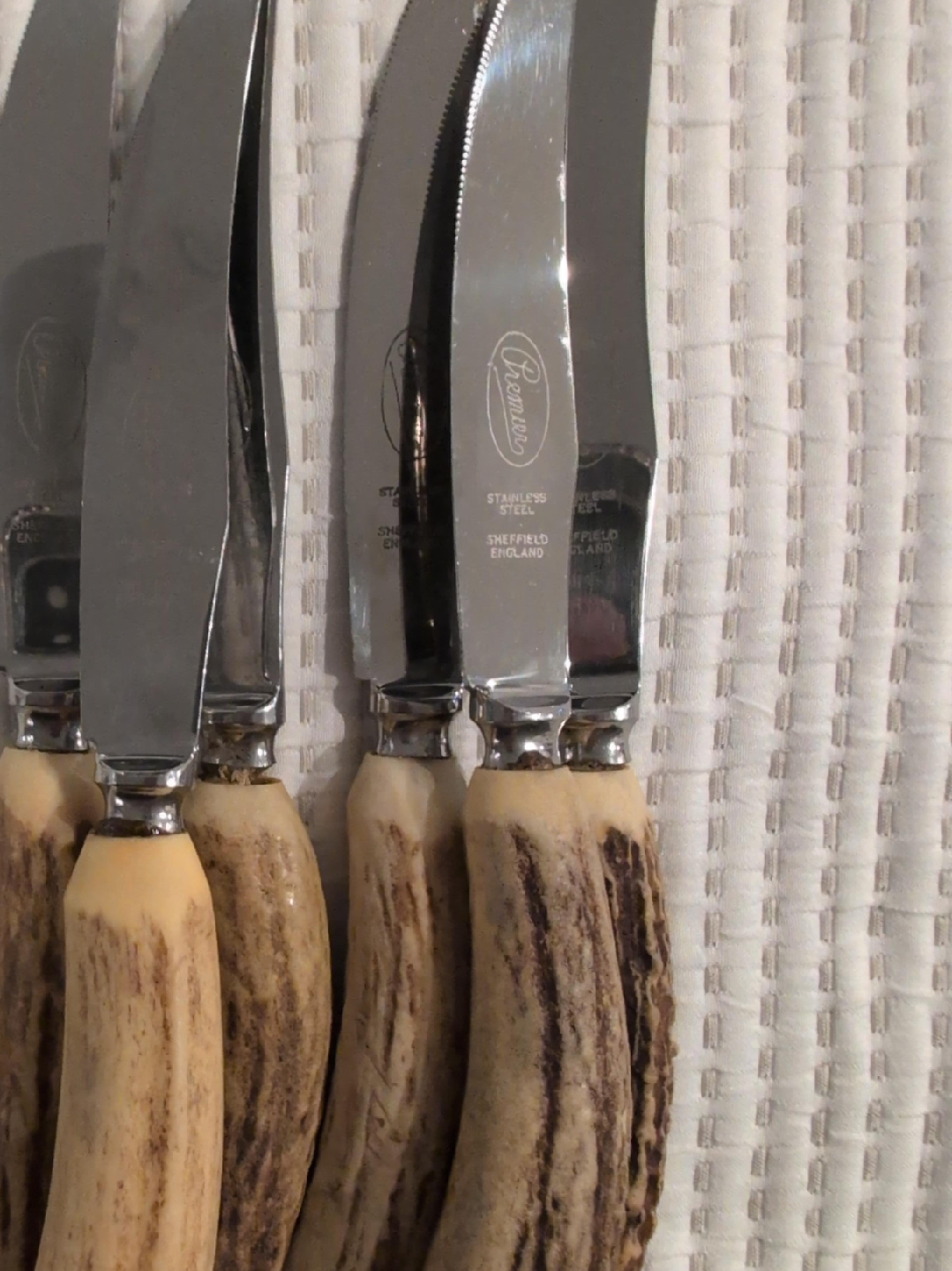 Set of 6 Premier Sheffield England stainless steel knives with unique handles. They are in good condition and ready for a new home!