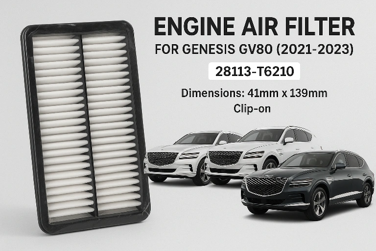 Part Number (OE/OEM): 28113-T6210 – Factory-Matched Quality Key Features Dimensions: Height 41 mm × Width 139 mm – direct, easy front installation. Mounting Type: Clip-on, no special tools required. Manufactured in China – reliable performance at an affordable price. Reference Number: PA99898 (cross-compatible). Compatible Vehicles This engine air filter fits the Genesis GV80 with the 2.5L Turbo I4 engine for the following model years: YearModelEngine2021Genesis GV802.5L Turbo2022Genesis GV802.5L Turbo2023Genesis GV802.5L Turbo Why Choose This Air Filter? Fast and simple installation thanks to the clip-on design. Exact OEM fitment for optimal airflow and engine efficiency. Enhanced engine performance with superior filtration quality. Genuine OEM part number (28113-T6210) ensures compatibility and reliability.