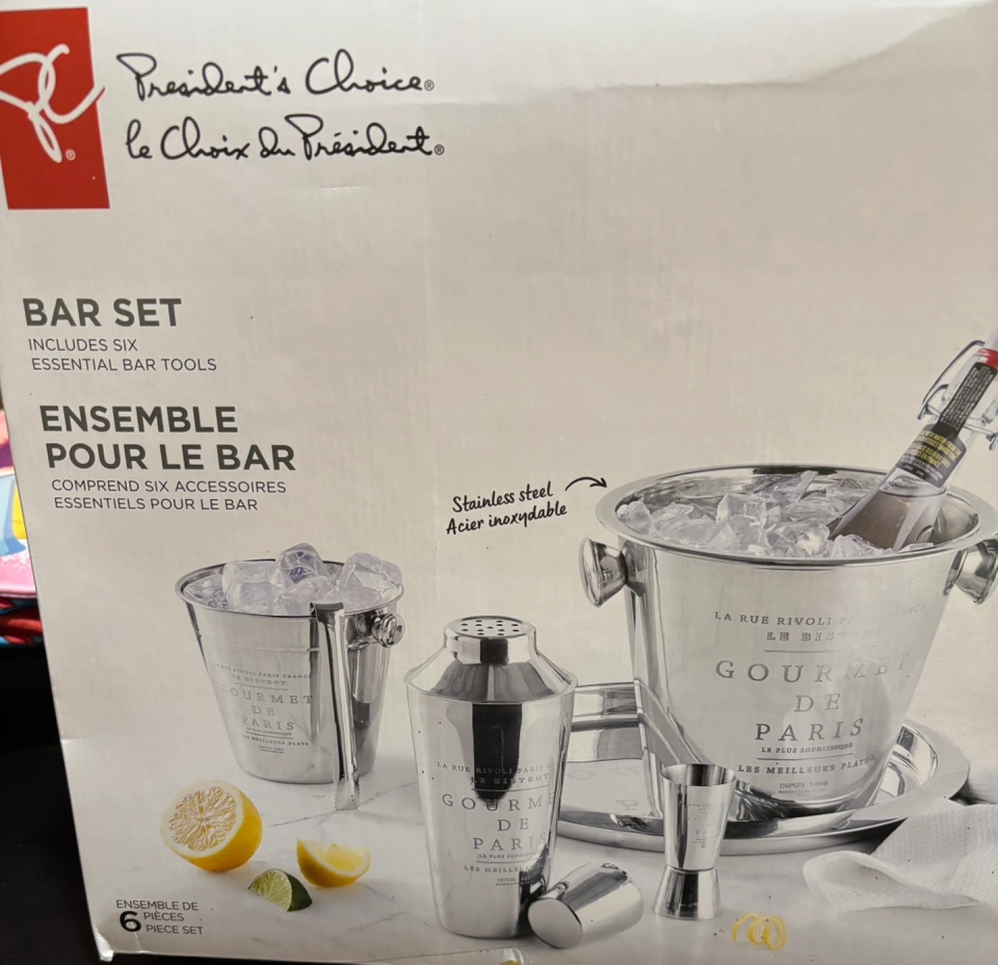 23President's Choice bar set includes six essential bar tools. This ensemble includes six stainless steel accessories. Get ready to mix your favourite drinks! Location: Southeast area near Southcenter Mall