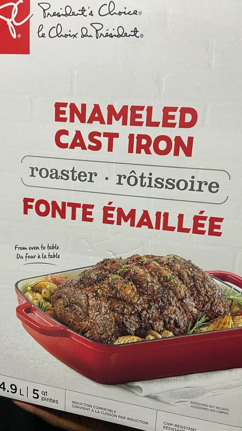 This President's Choice enameled cast iron roaster is 4.9L in size, perfect for roasting delicious meals! It's in new condition and ready to be the star of your kitchen. Here are some of its features: * Enameled cast iron * 4.9L capacity * Induction compatible * Oven-safe I think a reasonable price for this item is $75. If this ad is still up, the item is still available! Let's get cooking!