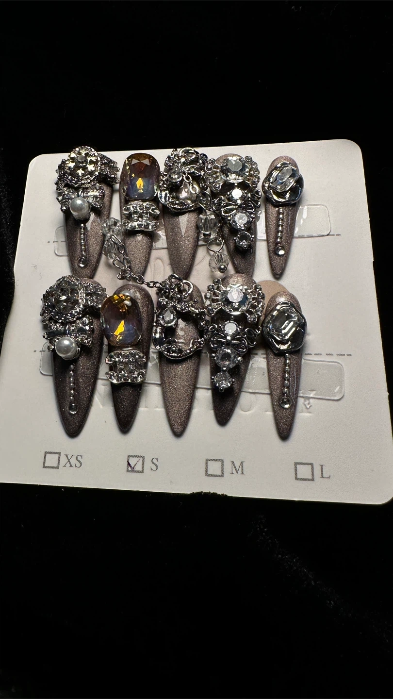 10These nails are decorated with silver embellishments and jewels for a unique look