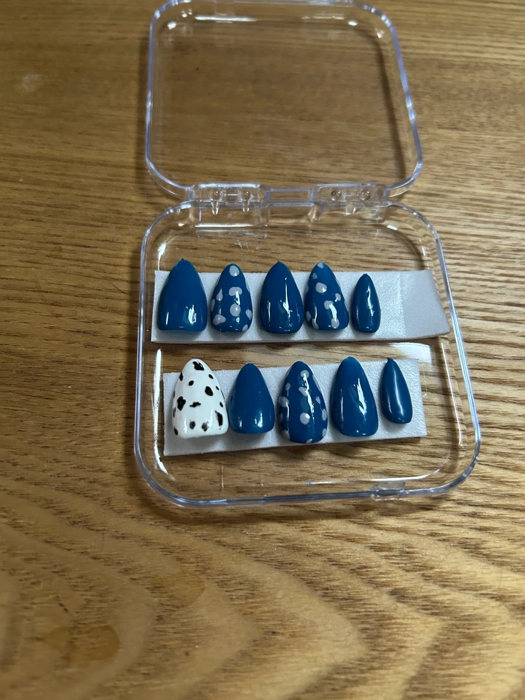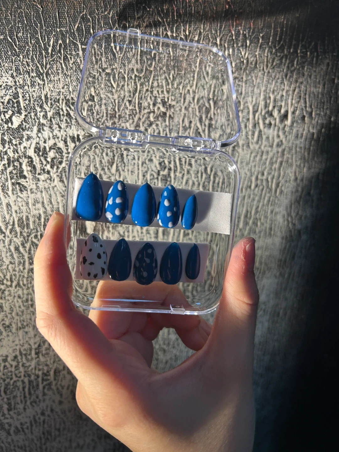 Press-on nails in a cute blue and white design! Come in a clear storage box for safekeeping. Perfect for a quick and easy manicure at home