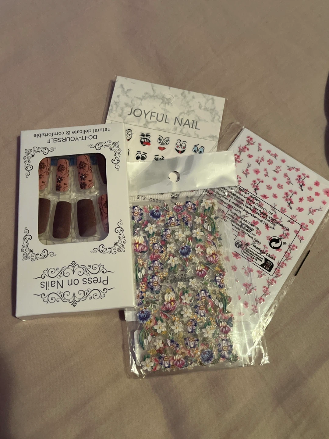15Selling a set of press on nails and some nail art stickers. The press on nails are 'Do-It-Yourself' and described as natural, delicate, and comfortable. Also included are nail art stickers from Joyful Nail and other floral designs. All items are brand new!