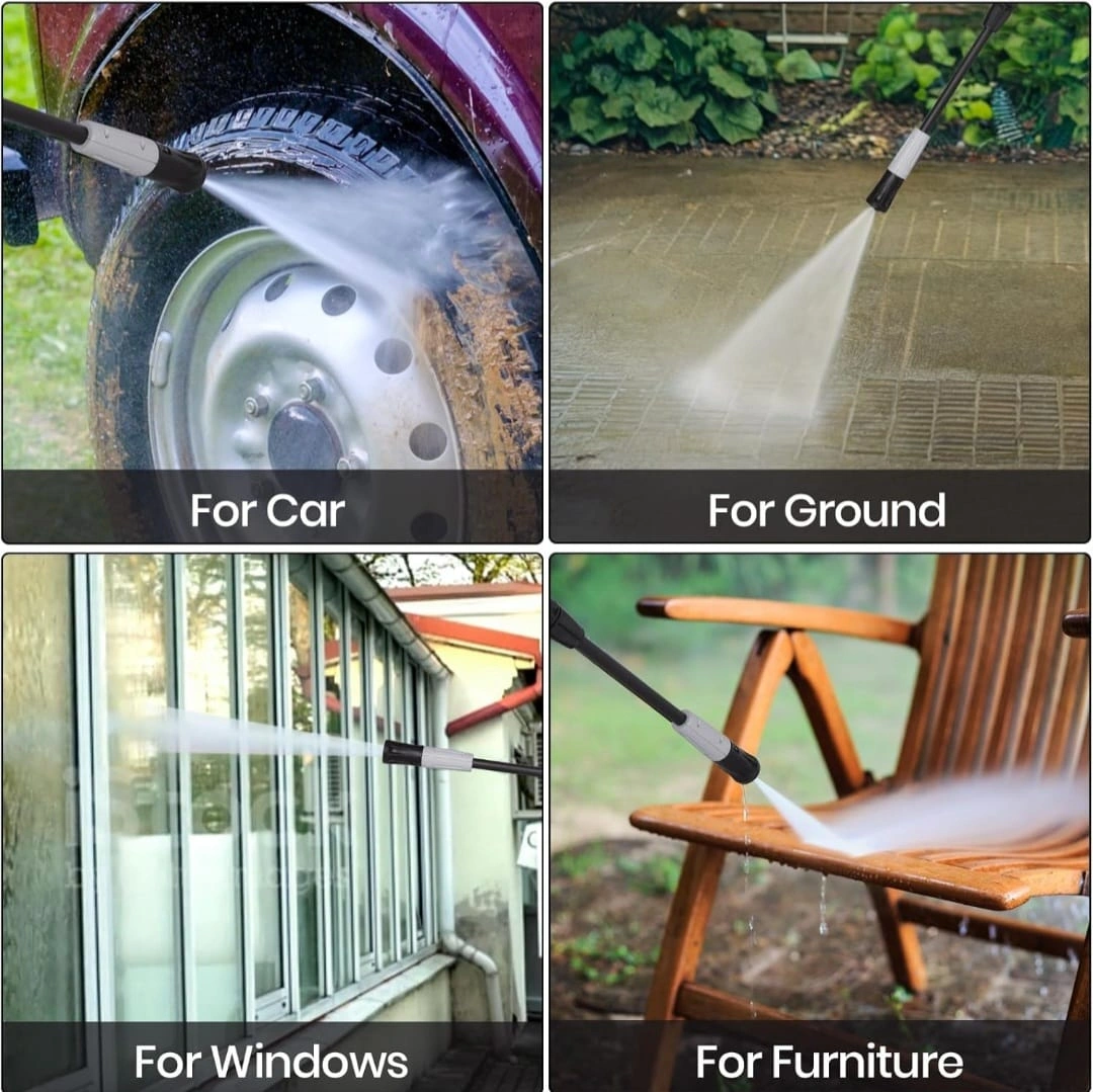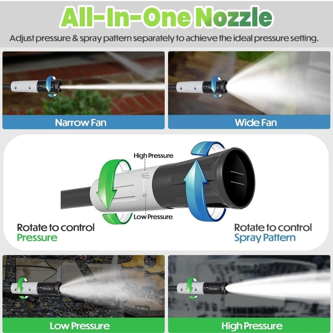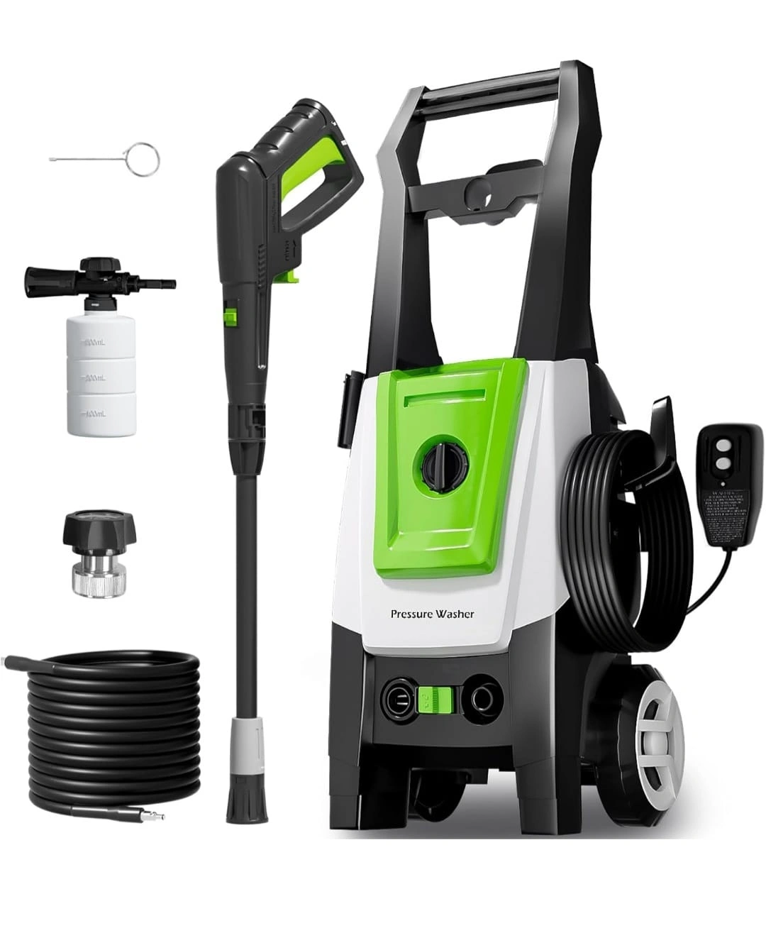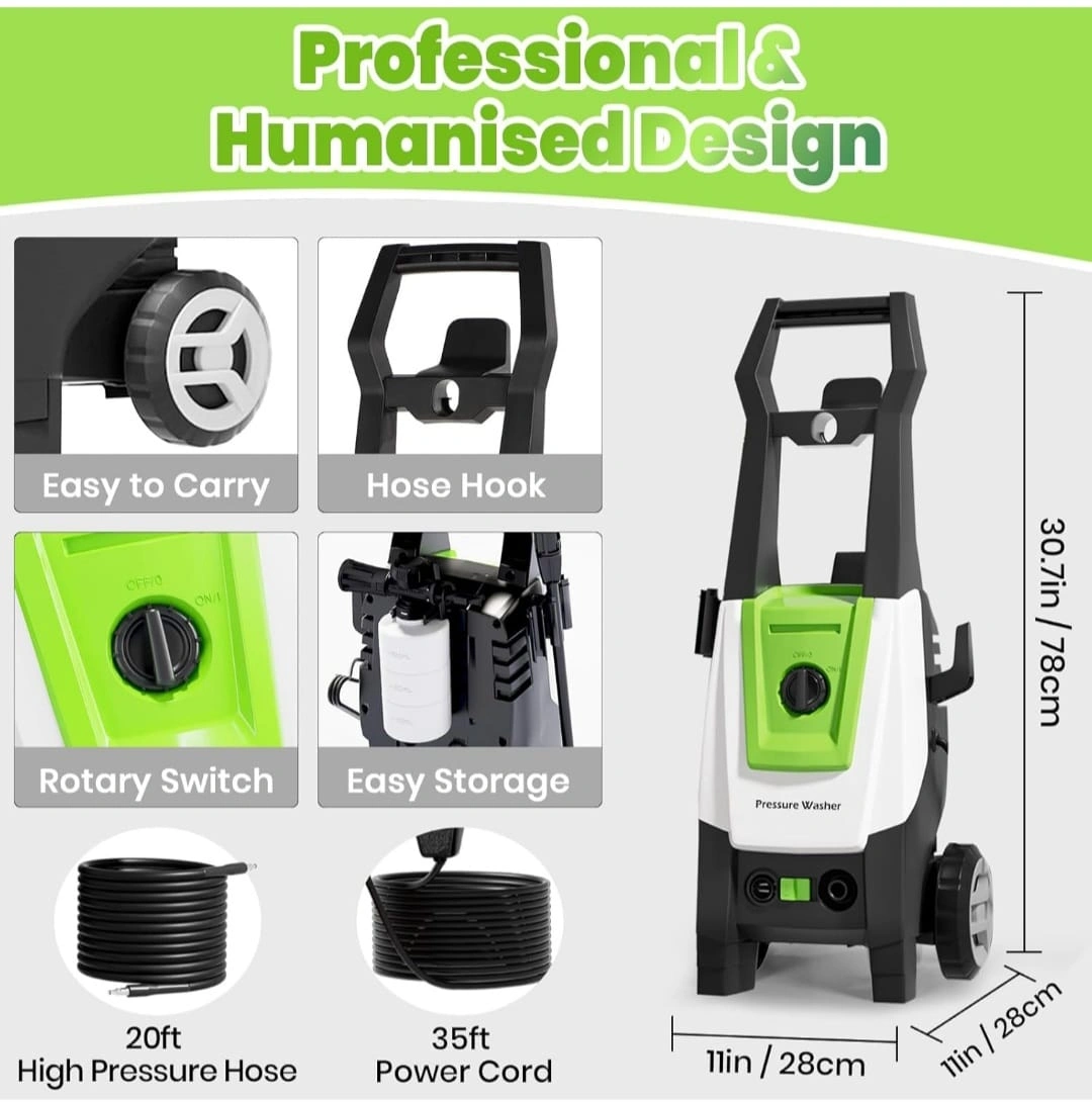 111This pressure washer is perfect for cleaning cars, grounds, windows, and furniture. It features an all-in-one nozzle to adjust pressure and spray pattern. It's easy to carry and store, with a hose hook and rotary switch. The dimensions are 30.7in / 78cm (height) and 11in / 28cm (width). Includes a 20ft high-pressure hose and a 35ft power cord