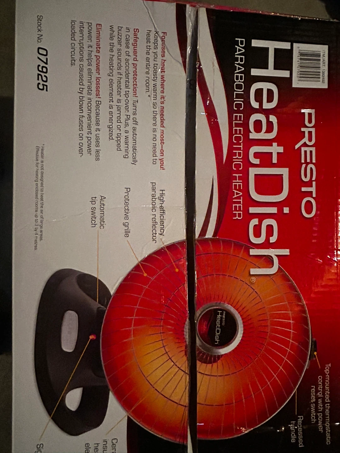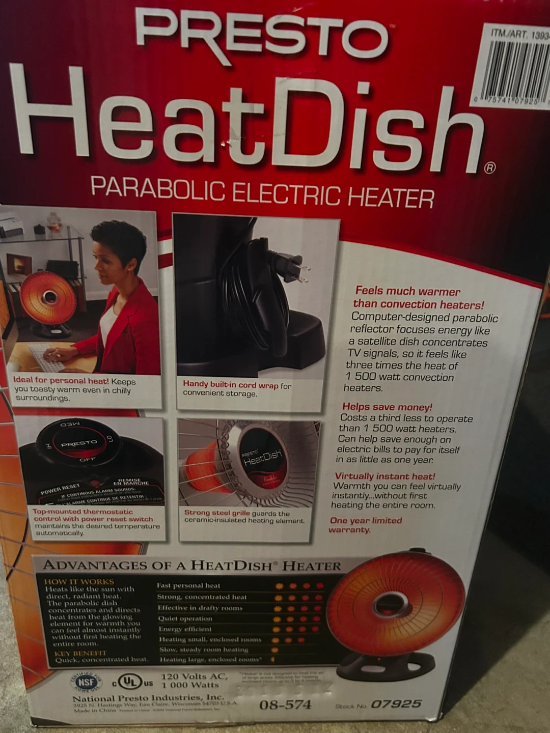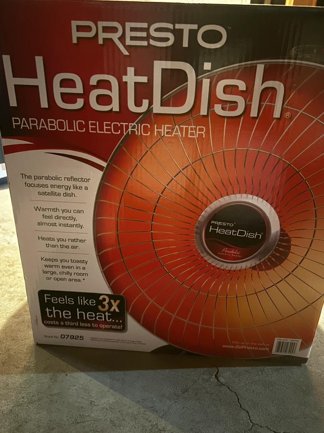 409Selling a Presto HeatDish parabolic electric heater. It feels much warmer than convection heaters! The computer-designed parabolic reflector focuses energy like a satellite dish concentrates TV signals, so it feels like three times the heat of 1500 watt convection heaters. It also helps save money and costs a third less to operate than 1500 watt heaters. Can help save enough on electric bills to pay for itself in as little as one season