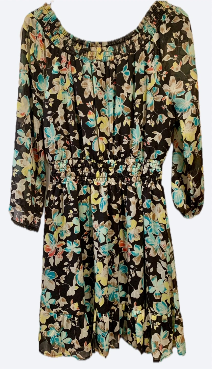 15Sunny days have finally arrived so what better time to add a pretty and colourful floral dress to your wardrobe for a fraction of the price?! Floaty, flowy and flattering, and infused with vintage and retro charm, this whimsical and playful number will add some bohemian flair and rustic elegance to your collection. Featuring a deep-scoop elasticated neckline with subtle frill trimming, three-quarter length sleeves and gathered elasticated waist, this on or off-the-shoulder dress hangs beautifully, making it the perfect throw-on essential for all occasions. Its feminine, soft and relaxed silhouette is further enhanced by a beautiful floral print of turquoise, teal, yellow, orange, red and ochre wildflowers, embodying romance and nature, on black. Chic and classy yet comfortable and casual, this fun and flirty number can be dressed up or down. Fabulously versatile, it will pair well with strappy sandals for an outdoor concert; ballet flats for a romantic picnic date; or runners for a stroll around the county fair! As this dress is lined, not only is it ideal for those slightly chillier summer days and nights, but it's perfect for early fall. Whether it's a visit to the pumpkin patch, roaming around the farmer's market or sipping cider at the local brewery, this multi-seasonal wardrobe must-have will look great with a pair of western-style, ankle or even biker boots. This gorgeous dress doesn't fit me so it has NEVER BEEN WORN. Even though it no longer has the tags, it's fairly priced for this brand! Meet-up location: The Black Sheep, Maple Ridge (I encourage you to try the dress on before you buy)