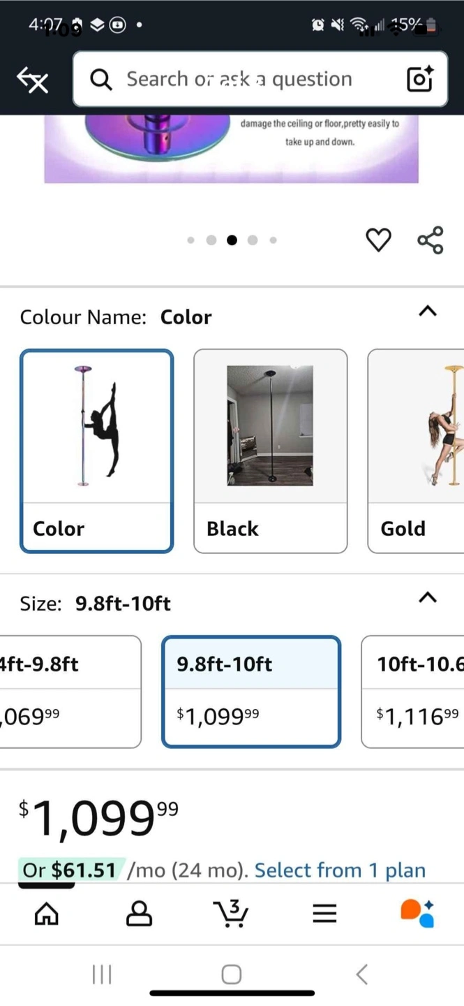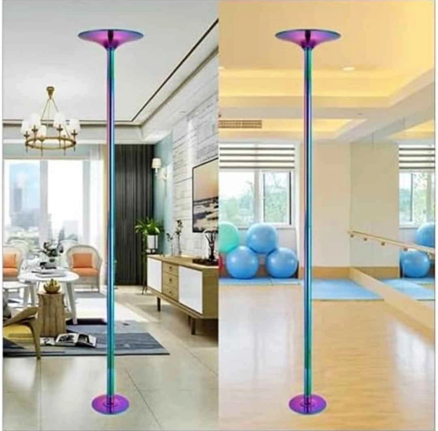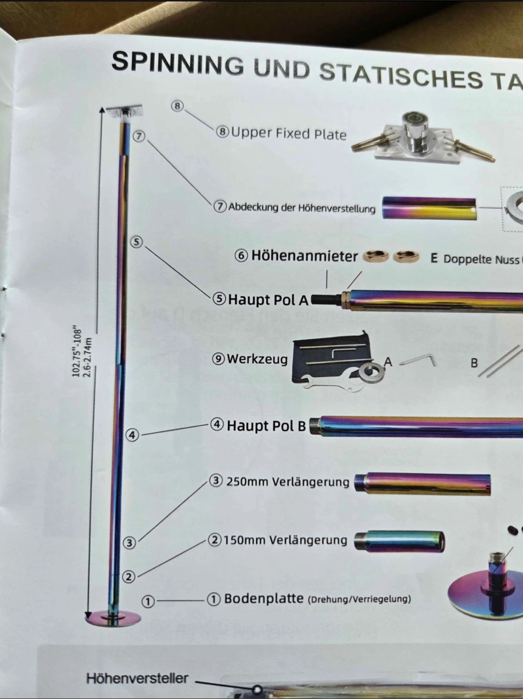 Selling a spinning and static dance pole that is adjustable from 9.8ft to 10ft. It comes with all the components for assembly, including the upper fixed plate, height adjustment cover, height adjuster, main pole A and B, extensions (250mm and 150mm), base plate, and tools for setup