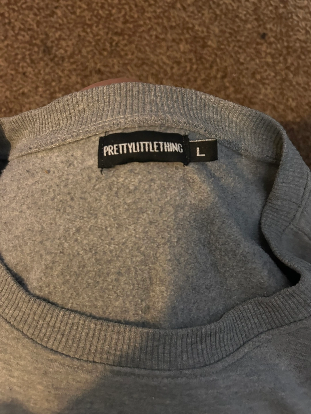 Cozy grey sweatshirt from PRETTYLITTLETHING! It's a size L and in great condition. Perfect for lounging around or casual outings. It's super comfy and easy to wear
