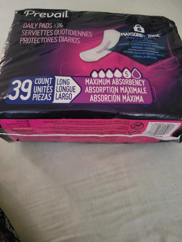 Selling a package of Prevail Daily Pads. This package includes 39 long pads with maximum absorbency. They feature MaxSorb+ Zone technology for quick absorption and locking in wetness.