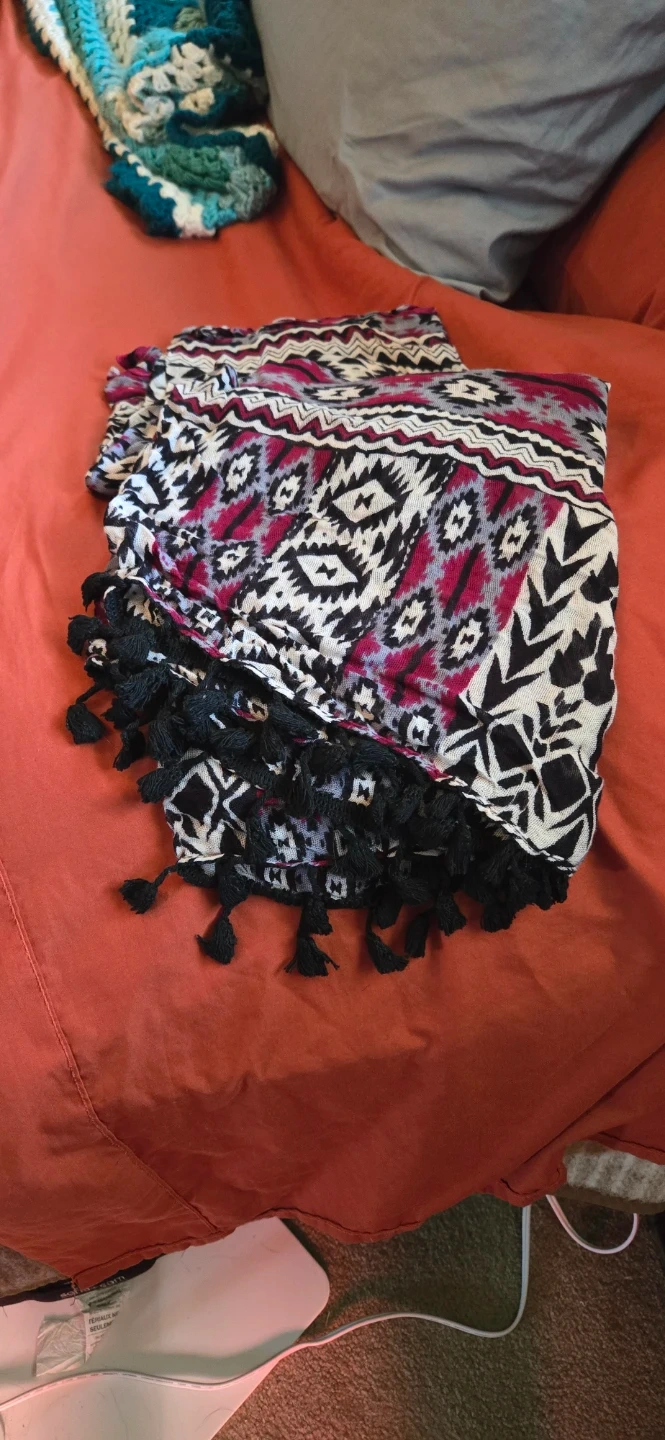 Scarf with a geometric pattern and black tassels along the edge. It's made of a lightweight fabric, perfect for adding a pop of colour to an outfit. The pattern includes shades of magenta, black, white, and grey.