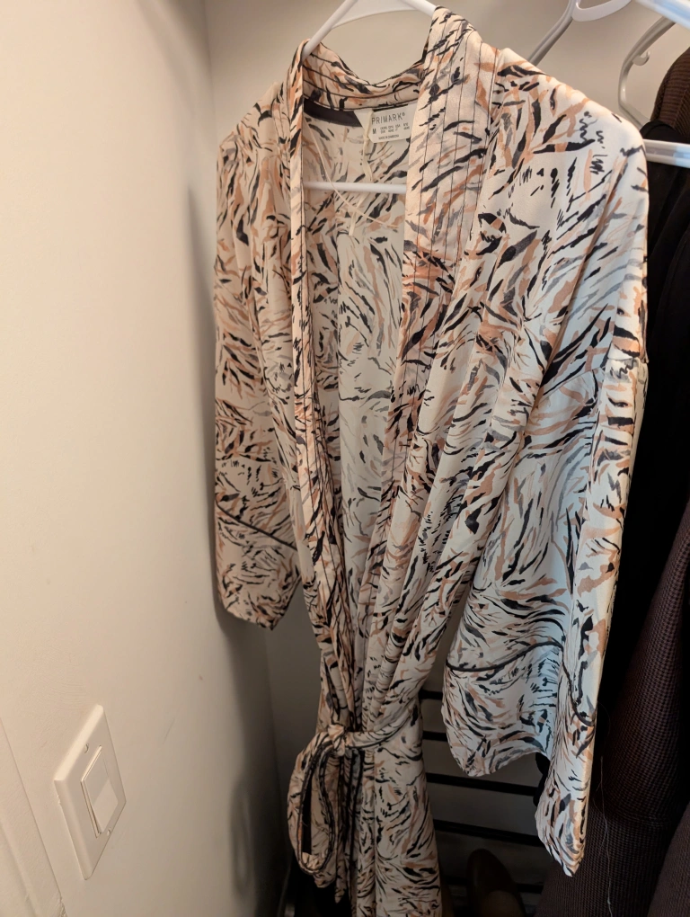 Selling a Primark kimono robe in size medium! It's in great condition and features a unique animal print design. Perfect for lounging around the house or as a stylish cover-up worn maybe twice