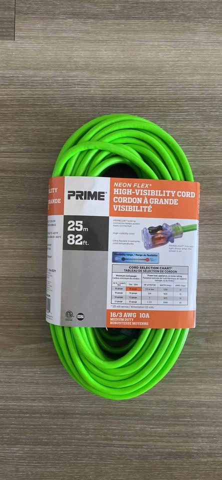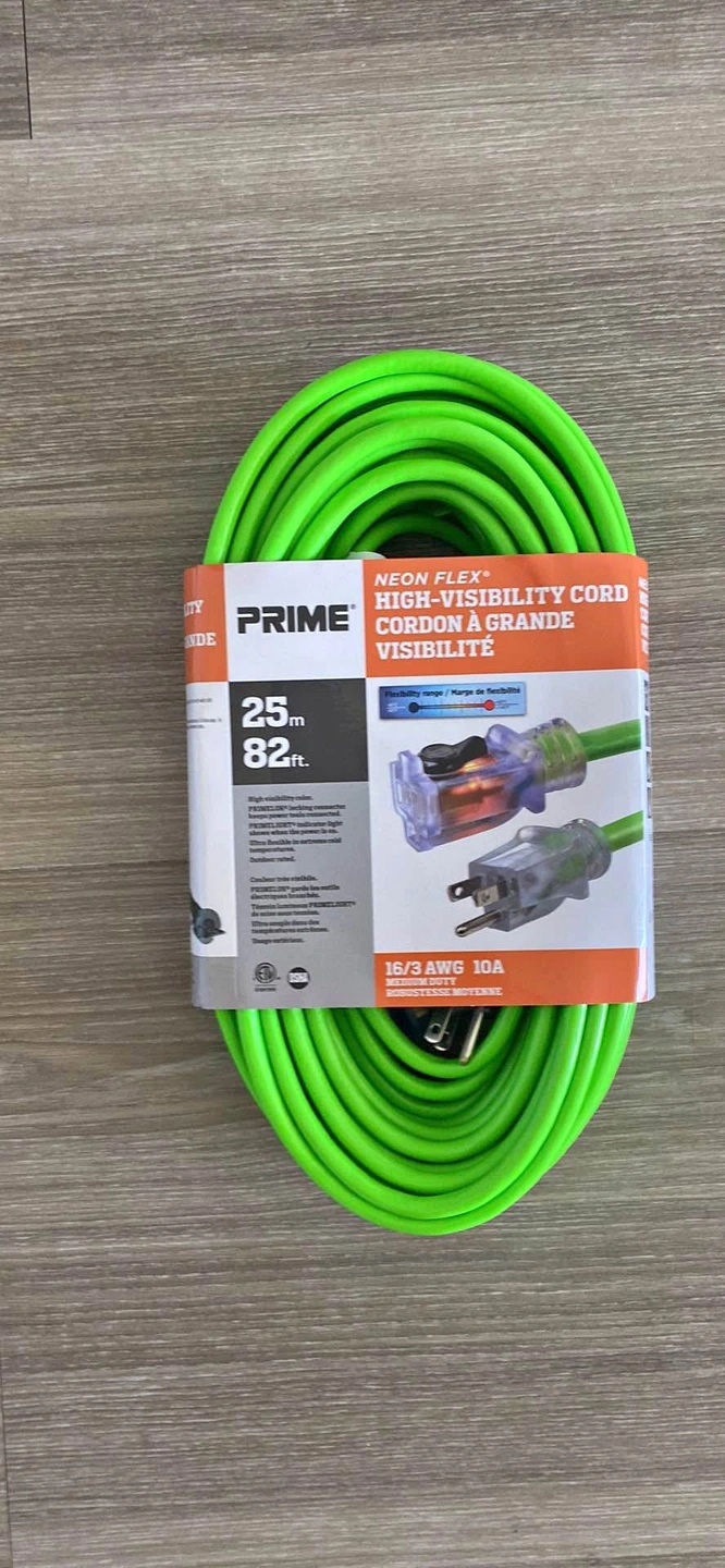 60Brand new prime outdoor extension cord 25m 82 feet. Comes with an outlet lock and power indicator. Outdoor graded. Hamilton pickup